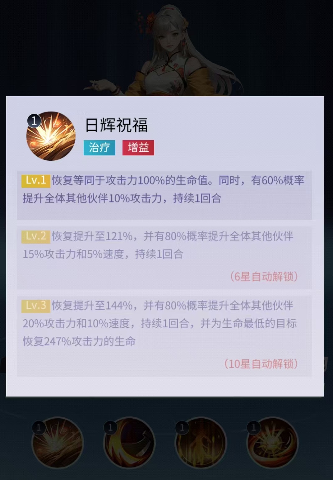 日游神的核心价值体现在其一技能的复合增益效果上。该技能升至满级后,不仅能为全体友方单位恢复大量生命值,还可概率触发“全队攻击力提升”与“全队速度提升”双重效果。其中,速度加成尤为关键——在回合制战斗中,更高的速度属性意味着更早的行动顺序,从而实现先手控场、抢先治疗或抢占关键增益时机,形成显著的战术压制优势。