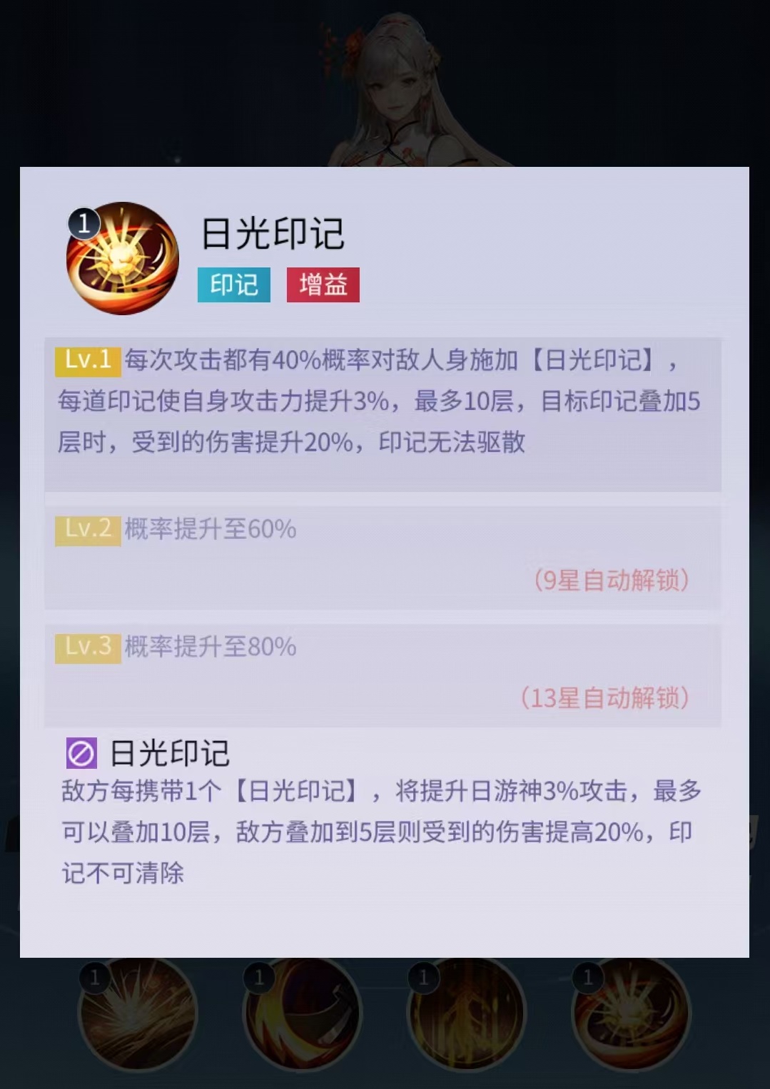 二技能为普通攻击变体,可随机对三名敌方目标造成伤害,属于基础输出补充,功能性偏弱。其被动天赋则稳定提供攻击力、最大生命值与治疗效果三项属性加成,进一步强化其生存与续航能力。大招机制具备成长性:每次普攻有概率为目标施加“日光印记”,每层印记提升自身3%攻击力,最多叠加10层;当目标身上的印记达到5层时,其所受伤害提升20%。该设定不仅增强日游神自身的治疗转化率(因攻击力提升同步放大治疗量),也通过易伤效果间接提升全队输出效率,形成“自辅+团辅”的双重价值闭环。