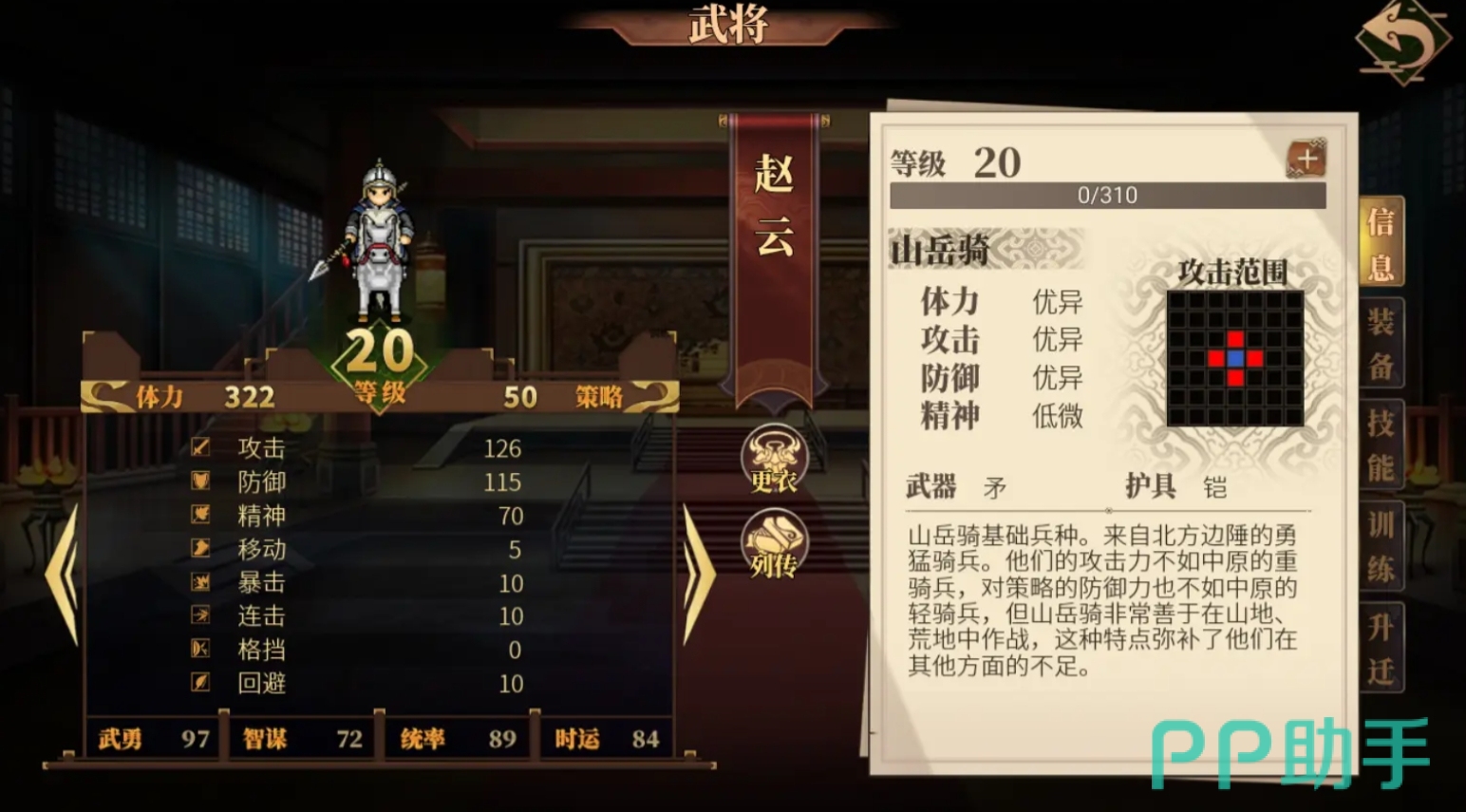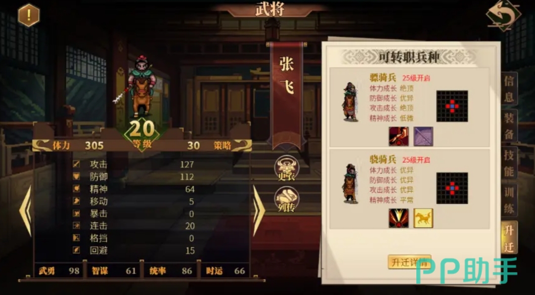 而要想完成武将转职,所需的条件也很简单,那就是通过升迁将武将培养到25级,便可在所给出的转职选项中挑一个来进行转职。每一种转职方向都详细介绍了该武将转职后的属性成长变化、所获得的技能等资料,方便人们进行查看。