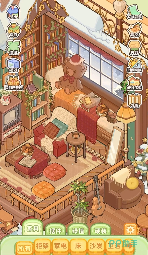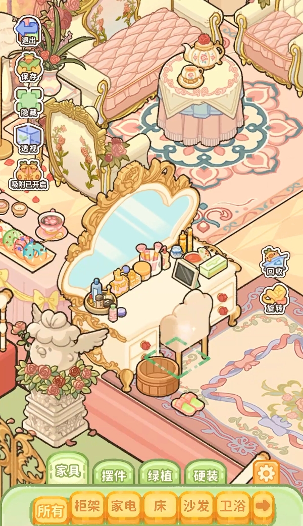 游戏内置海量家具与装饰物件,覆盖实木柜体、布艺沙发、智能家电、嵌入式厨电等全品类选项。所有物品均支持无限制拖拽摆放,支持360度旋转、多层堆叠及墙面贴合操作。例如冰箱可嵌入橱柜,空调可隐藏于吊顶,小摆件如马克杯、果盘、香薰蜡烛等亦能精细陈列于台面,显著增强生活化真实感与视觉层次。