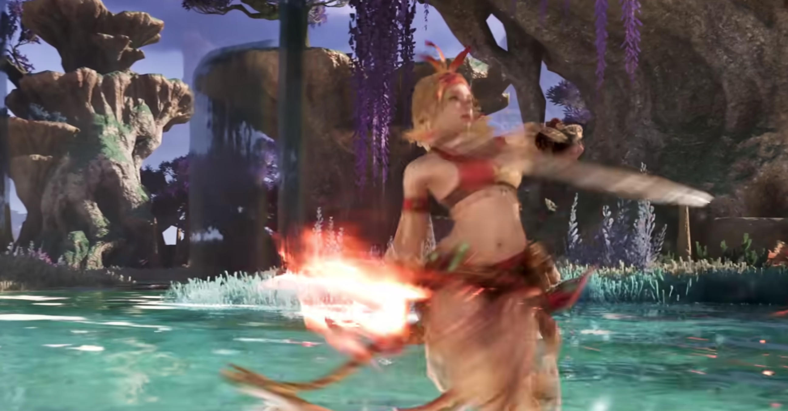 从外观设计来看,蕊儿充满了异域风情。浅金色的短发随风轻扬,发间装饰着鲜艳的红羽和金属饰品,仿佛将炽热的沙漠阳光凝聚成了身上的每一处细节。战斗中,她的衣袂与饰带随动作飘舞,手持一对锋利弯刃,整体形象宛如一阵席卷而来的烈风,充满动感与力量。