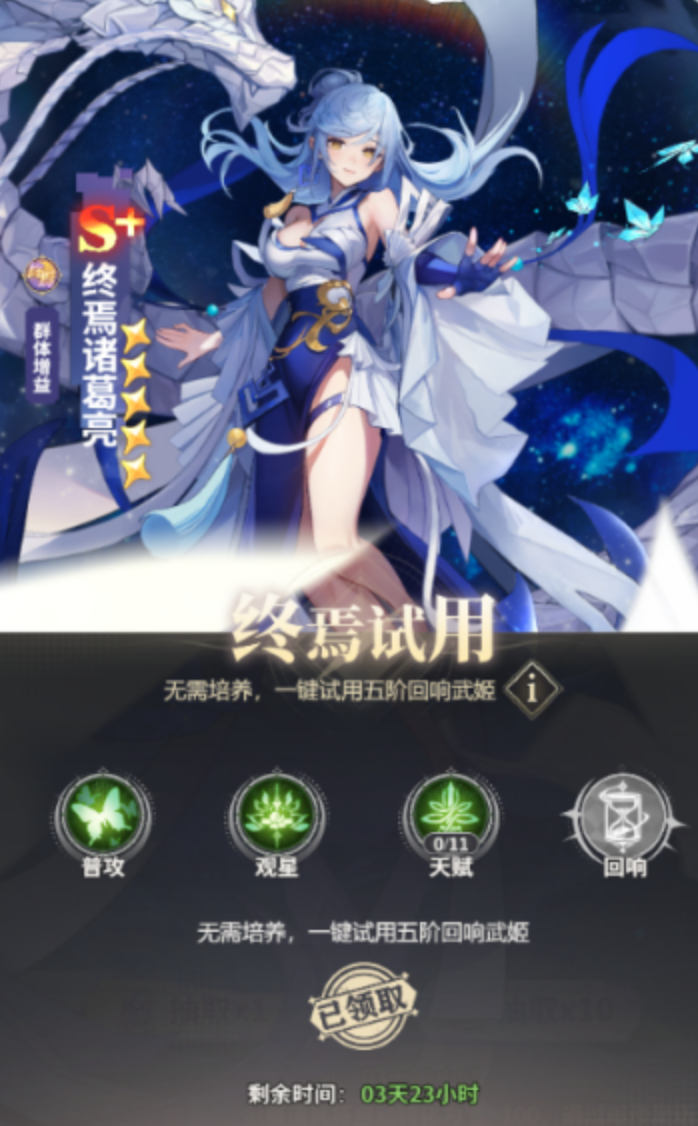 终焉武姬并非永久开放获取,而是采用分阶段限时投放机制。首期“终焉招募”活动于服务器开启后第11天正式上线,入口位于主城界面顶部区域。每期活动持续7个自然日,结束后将轮换至下一位终焉武姬。每位终焉武姬对应的招募令仅在当期活动有效期内生效,错过即需等待后续周期。游戏运行至第67天时,常驻终焉招募系统正式开启,玩家可随时自由选择目标终焉武姬进行抽取,不再受活动周期约束。