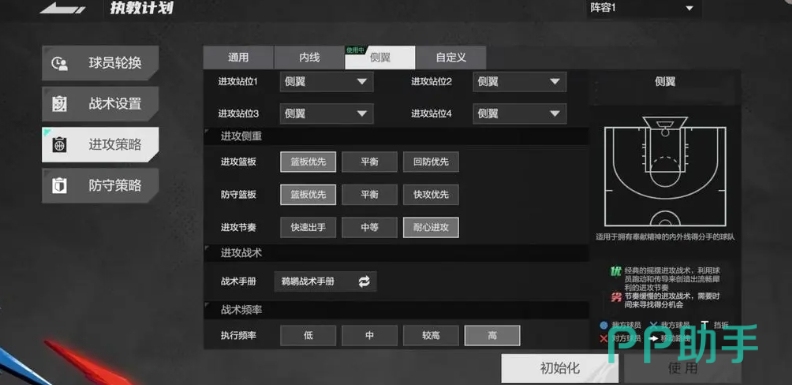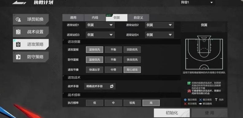 除了通用模式和内线模式等常见选择外,还有多种特色鲜明的进攻策略值得使用,其中侧翼进攻策略备受推崇,尤其适用于那些拥有具备奉献精神的内外线得分手的球队,侧翼进攻策略属于经典的灵活多变的进攻战术,它的核心在于利用球员之间的球灵跑动和精准传导,创造出流畅的进攻节奏,这种战术并非简单地依赖某一位球员的个人能力,而是通过整个团队的协作来打破对手的防线。