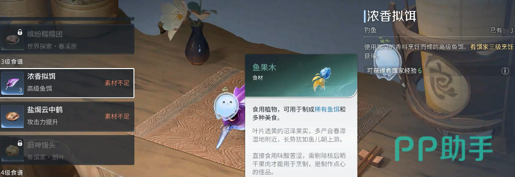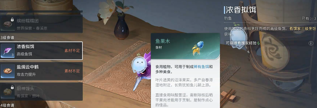 饵料选择同样不可忽视。浓香拟饵能显著提升褐斑龙鱼的上钩概率,已被大量实测数据验证为当前最优解。该拟饵需在游戏内烹饪台合成,配方固定为鱼果木与香料鱼粉。玩家需通过主动优化装备组合与饵料配置,系统性提升目标鱼种的捕获效率。