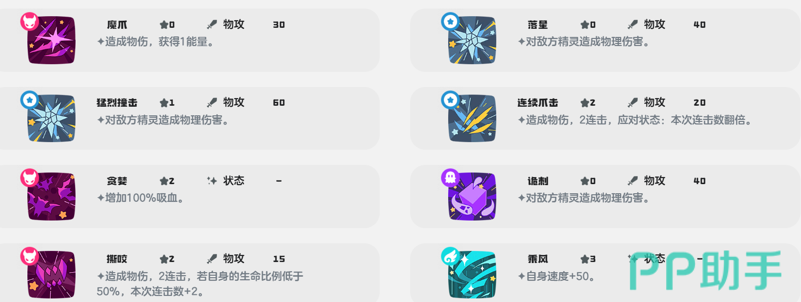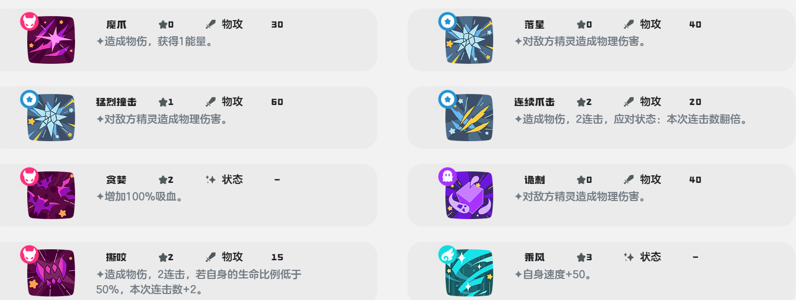 前期主要的输出技能有魔爪、连续爪击、翼击以及诡刺。连续爪击可以造成两次伤害,而且在应对时可以翻倍造成四次伤害。而普通魔爪在进攻后则可以获得1点能量。前期必用的技能有贪婪,可以增加100%的吸血效果,在自身生命被大幅削弱时可以增强续航,生存能力也会大大加强。