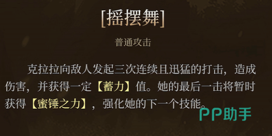 克拉拉的核心战斗机制围绕“蓄力值”展开,所有技能设计均服务于这一系统。作为重锤类武器使用者,她的战斗风格强调能量积累与阶段释放。普通攻击名为“摇摆舞”,可进行三段连续打击,每次命中都能为她积攒一定量的蓄力值。前三次攻击完成后,最后一击必定触发专属状态“秘锤之力”,该状态是衔接后续强化技能的关键。