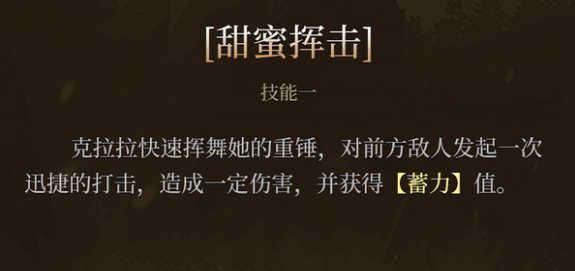 技能一“甜蜜回击”是一次高速挥锤攻击,命中后可获得基础蓄力值增益,主要用于起手或补足能量。相比之下,技能二则更具战术价值:克拉拉施展旋转冲锋,沿路径对周围敌人造成伤害,并依据所造成的伤害量返还蓄力值。若成功命中目标,该技能还将解锁派生技“蜜蜡锤”与“野蜂轮舞”,进一步延长输出链。