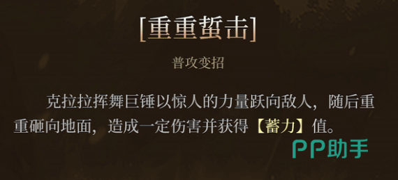 当“秘锤之力”激活后,克拉拉的普攻变招将转化为“重重蛰击”。此技能不仅提升伤害输出,还会使她快速突进至目标位置,并以巨锤砸地造成范围打击,同时补充额外蓄力值,为接下来的主动技能做准备。这种机制让她在连招衔接上具备极强的持续作战能力。