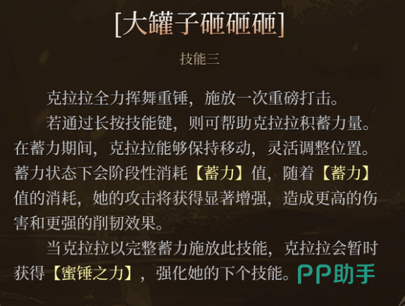蓄力释放技能三的同时,还能附加削刃效果,并再次获得“蜜锤之力”,用于强化下一个技能。她的终极技“女王命令”为远程范围打击,可锁定战场指定区域投掷蜜蜡锤,造成大范围高额伤害。配合充足的蓄力值和先前叠加的状态,克拉拉可在短时间内打出成吨爆发。