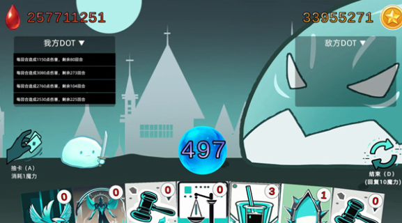 游戏底层规则围绕卡组动态演化展开:初始阶段卡牌种类繁杂,随着角色等级提升与伤害曲线攀升,卡组自动趋向精简高效,最终稳定为以中毒、灼烧、腐蚀等DOT效果为核心的战术组合。每轮行动需同步权衡三类关键操作——提升DOT倍率、恢复法力资源、解除Boss施加的抗性或减益状态。尤为特殊的是,所有DOT伤害均在Boss完成当轮行动后统一结算,由此形成“施加层数→承受反制→伤害跳变”的闭环逻辑。这一机制表面简洁,实则对玩家预判能力、容错把控与长期规划提出严苛要求。