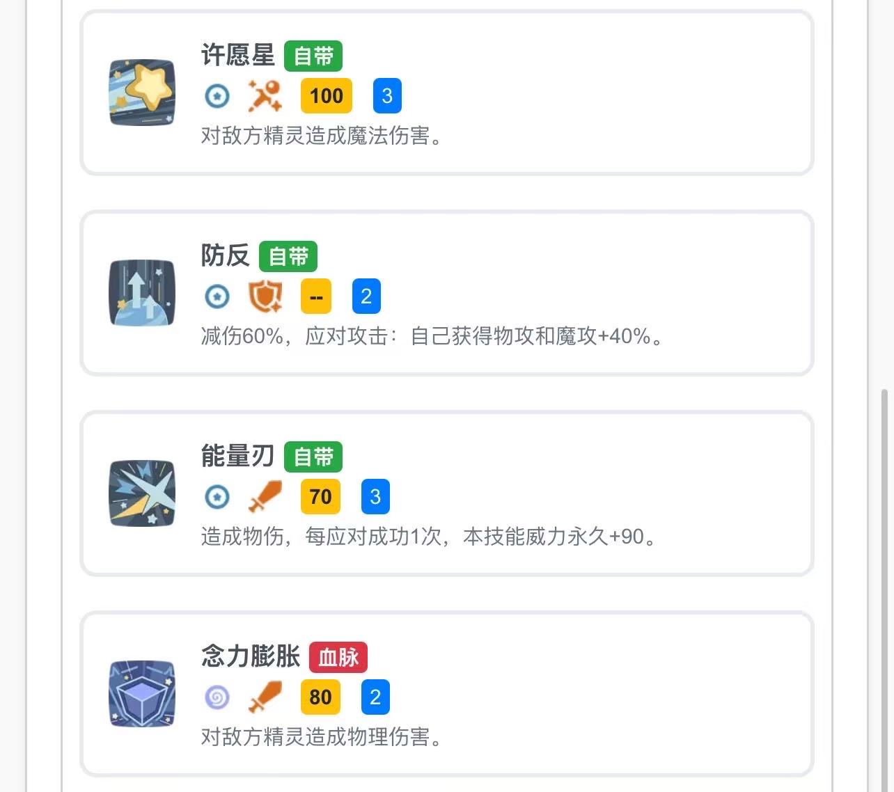技能配置需依据对手抗性灵活调整。面对低魔抗目标,推荐携带“许愿星”,单体魔法伤害稳定可靠;若需兼顾生存与反制能力,“防反”是优选——成功触发后提供60%减伤,并额外赋予40%双攻提升,显著增强持续作战强度。当敌方物抗薄弱时,“能量刃”则更具优势:不仅造成物理伤害,每次成功使用还可永久提升90点威力,越战越强特性突出。
