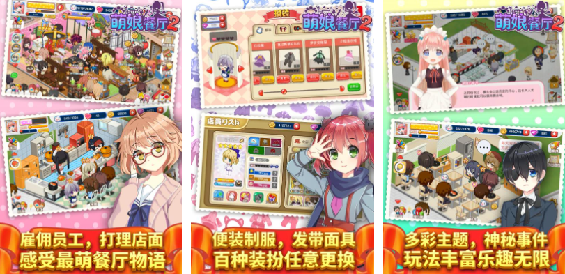 餐厅萌物语是拥有二次元萌系风格的餐厅经营类游戏,玩家可尝试管理店面并且雇佣大量员工,超萌的观赏效果跟不俗的自由度都是亮点,你也可以为服务员小姐姐塑造各种形象参与经营,各种主题的装修设定会让门店观赏性大大提升,无数神秘事件的出现让游戏的玩法显得更为丰富。