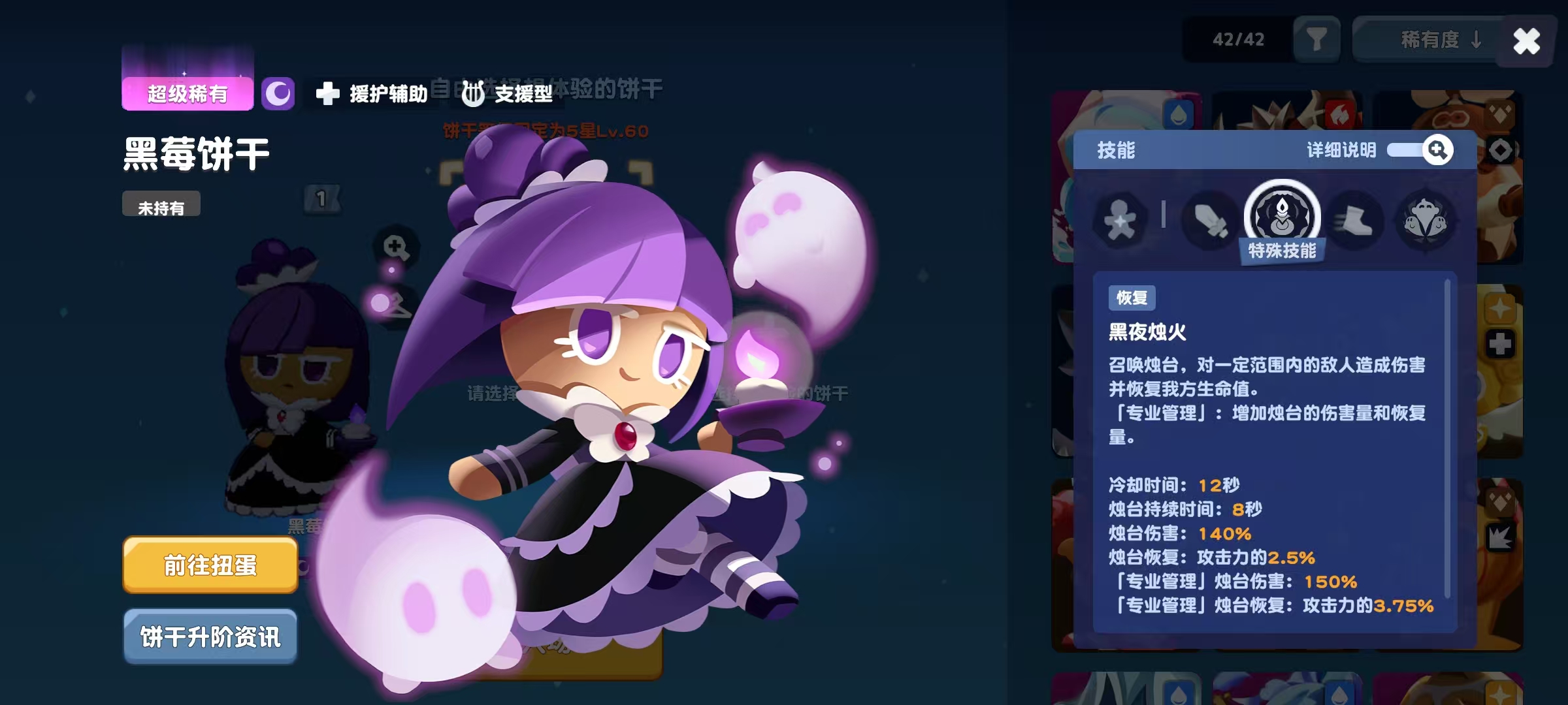 黑莓饼干属于超级稀有品质,具备较高的基础属性。其被动技能名为“干练的管家”,每间隔12秒会自动进入“专业管理”状态,使下一次释放的“黑夜烛火”和“该工作了”两个技能获得显著强化。这一机制决定了黑莓饼干的战斗节奏具有高度规律性,合理把握12秒的时间节点,是发挥其最大效能的关键所在。
