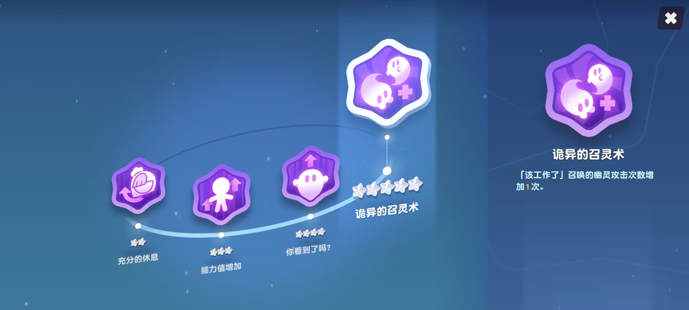 必杀技“该工作了”将召唤三只幽灵向敌方发起冲击,造成伤害的同时降低目标全体属性抗性。幽灵返回时会为周围友方饼干恢复生命值,每次攻击后返还一定血量,最多攻击4次,持续时间上限为12秒,技能冷却30秒。当处于“专业管理”状态时,幽灵的伤害输出与治疗效果均得到增强。因此,黑莓饼干的核心定位在于团队续航与辅助支持。