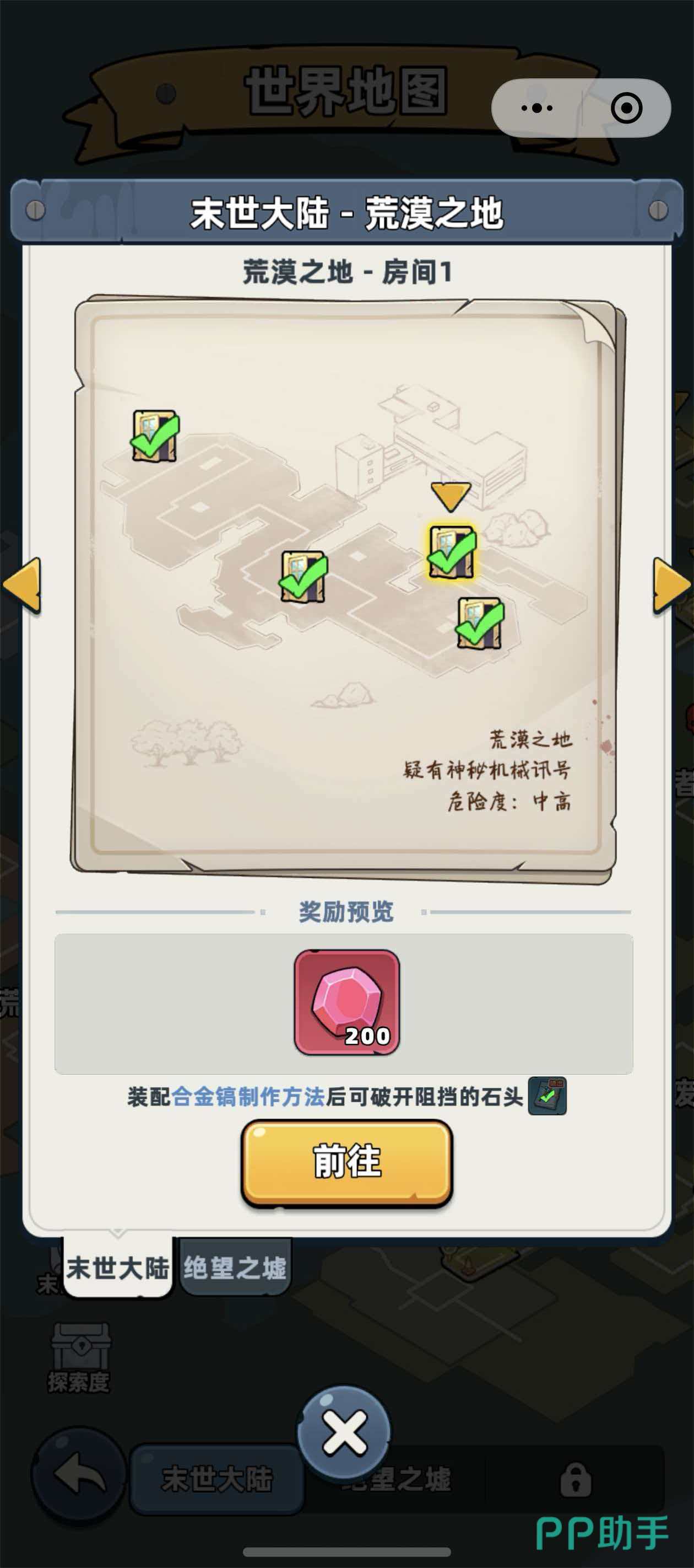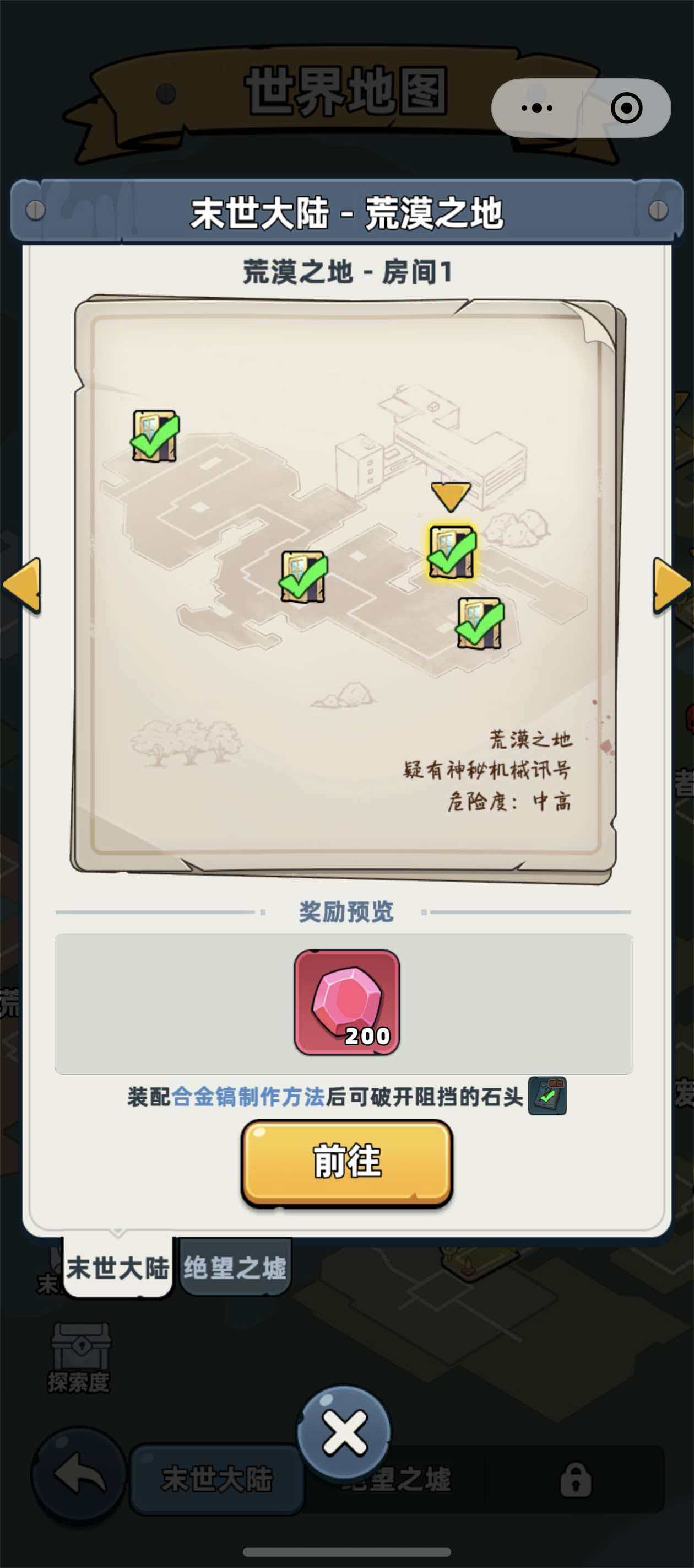 荒漠之地的钥匙并非随机刷新于地图表面,而是集中分布在特定房间内。玩家需主动进入这些可探索房间,通过战斗与解谜机制获取钥匙。定位方式为:点击右上角小地图,在左下角切换至“探索度”界面——该面板将完整显示荒漠之地所有已解锁及待探索的房间位置。选择目标房间后直接点击即可传送抵达。需特别注意:每个房间均设有最低战力门槛,若角色总战斗力不足,将无法成功开启探索流程,建议提前强化武器、升级护甲并补充弹药后再行挑战。