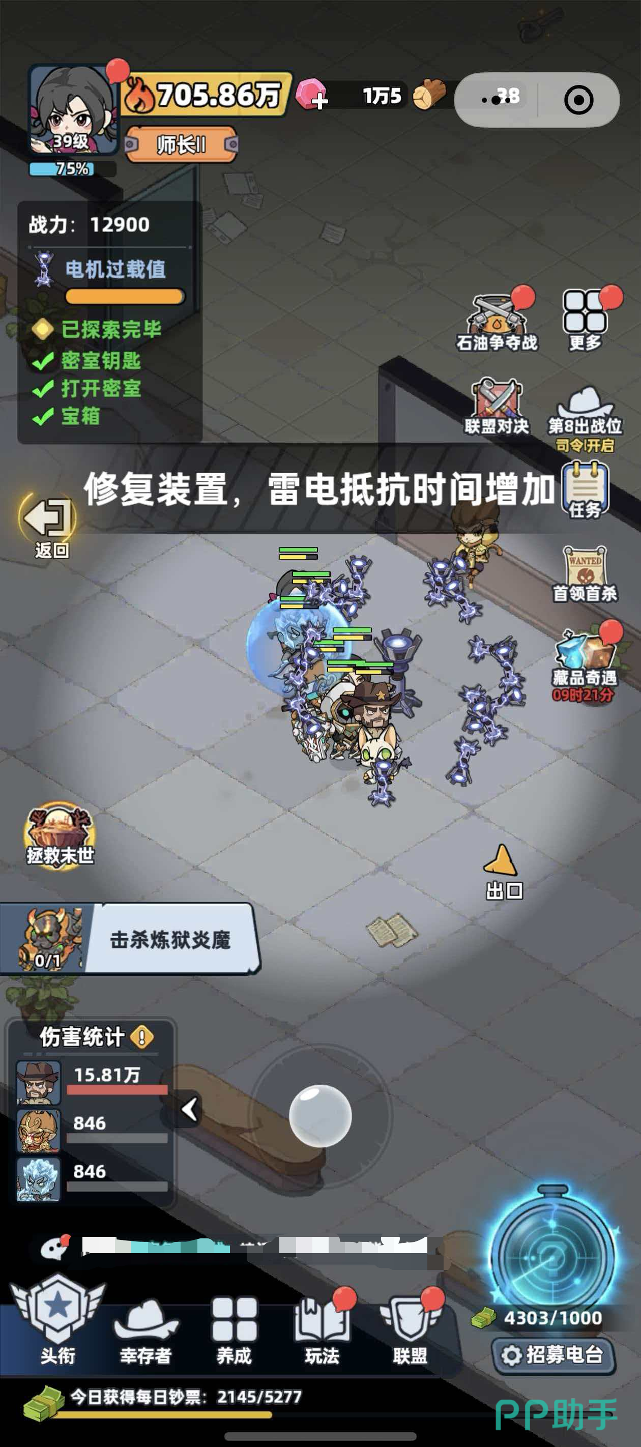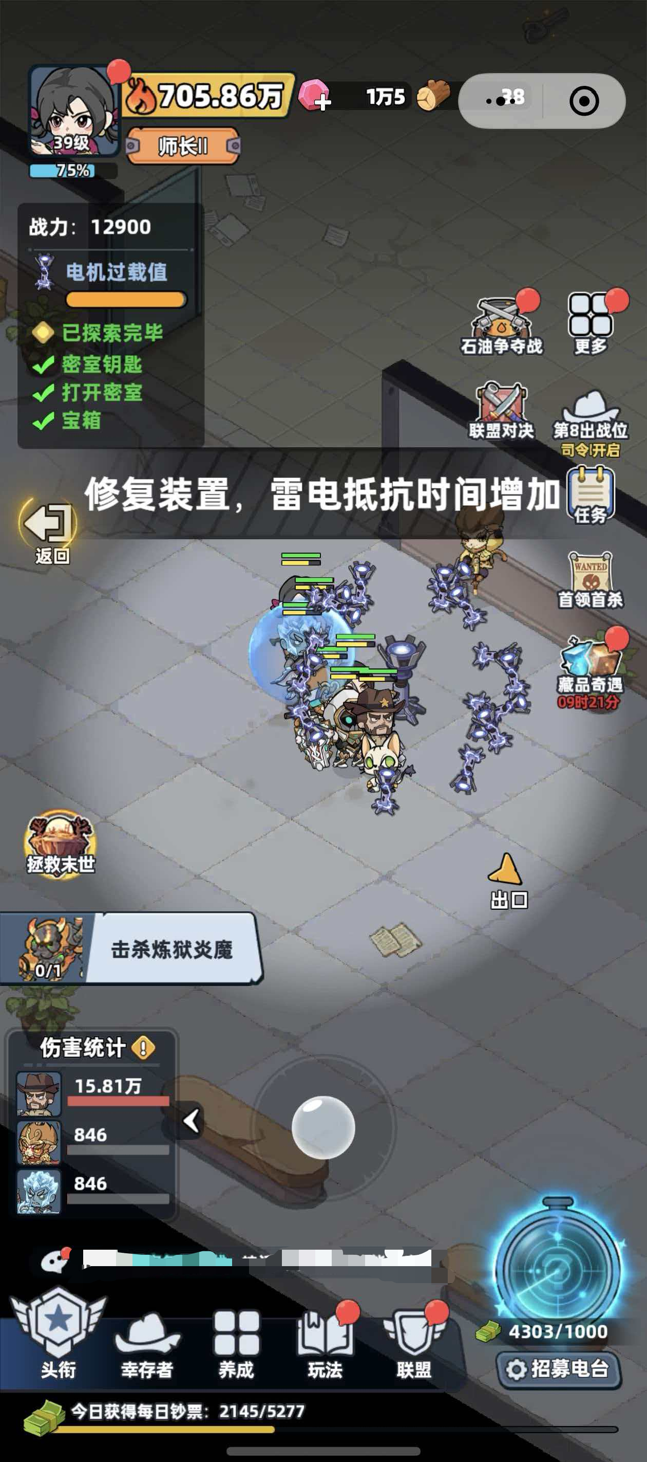 第二类为高风险高回报房间,其核心机制围绕“电机过载值”展开。此类空间无明确地图标识,仅在探索度界面以特殊图标隐性提示。进入后,屏幕左上角实时显示当前过载数值,一旦归零,全屋电力系统瘫痪,触发连锁爆炸并造成持续伤害。玩家须及时前往指定电机位置进行充能操作。尽管该类房间数量稀少、入口隐蔽,但丧尸击杀后钥匙掉落率显著提升——几乎每只敌人都有几率掉落钥匙;同时,最终区域设有密室机关,需使用“密室钥匙”方可开启,内含稀有蓝图、高级配件及大量资源。