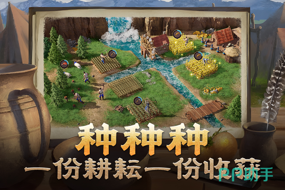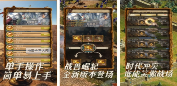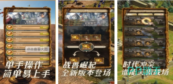从最古老的原始时代开始,玩家可以一步步在成长发展,不断的锻造出更加厉害的武器,推动文明的进步,同时建造强大的帝国,经营好自己帝国的经济,开发农业的发展,体验多样化的产业进步,游戏中除了简单的发展玩法之外,还有好玩的沙盘玩法,可以自由演绎沙盘排兵布阵,开启一场激烈的掠夺大战,收集丰富的资源。
