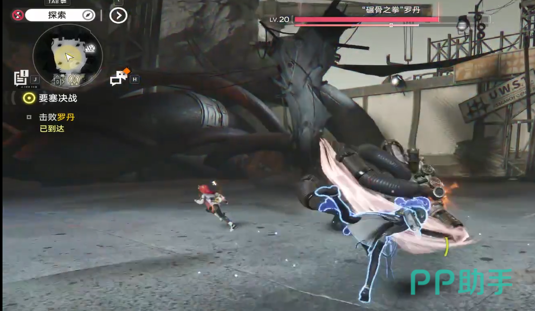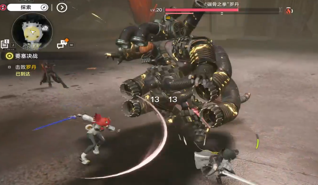 战斗初始阶段,罗丹会执行标志性起跳重击:先抬腿蓄力,地面同步生成红色预警范围圈,随后跃至空中完成下砸。该技能具备明确视觉提示与充足反应窗口,横向位移即可规避。落地后进入基础连段循环——右直拳→左上勾拳→双掌拍地震波,三段攻击间隔稳定,收招硬直约1.2秒,是主力干员输出的关键空档。当罗丹张开双臂呈环抱姿态时,即触发“擒拿”控制技,需立即向侧后方闪避,否则将被禁锢并承受高额持续伤害。值得注意的是,其存在一次无伤害位移机制:血量高于66%时,罗丹会随机向右侧跳跃约2米,此动作不附带攻击判定,仅用于调整站位。