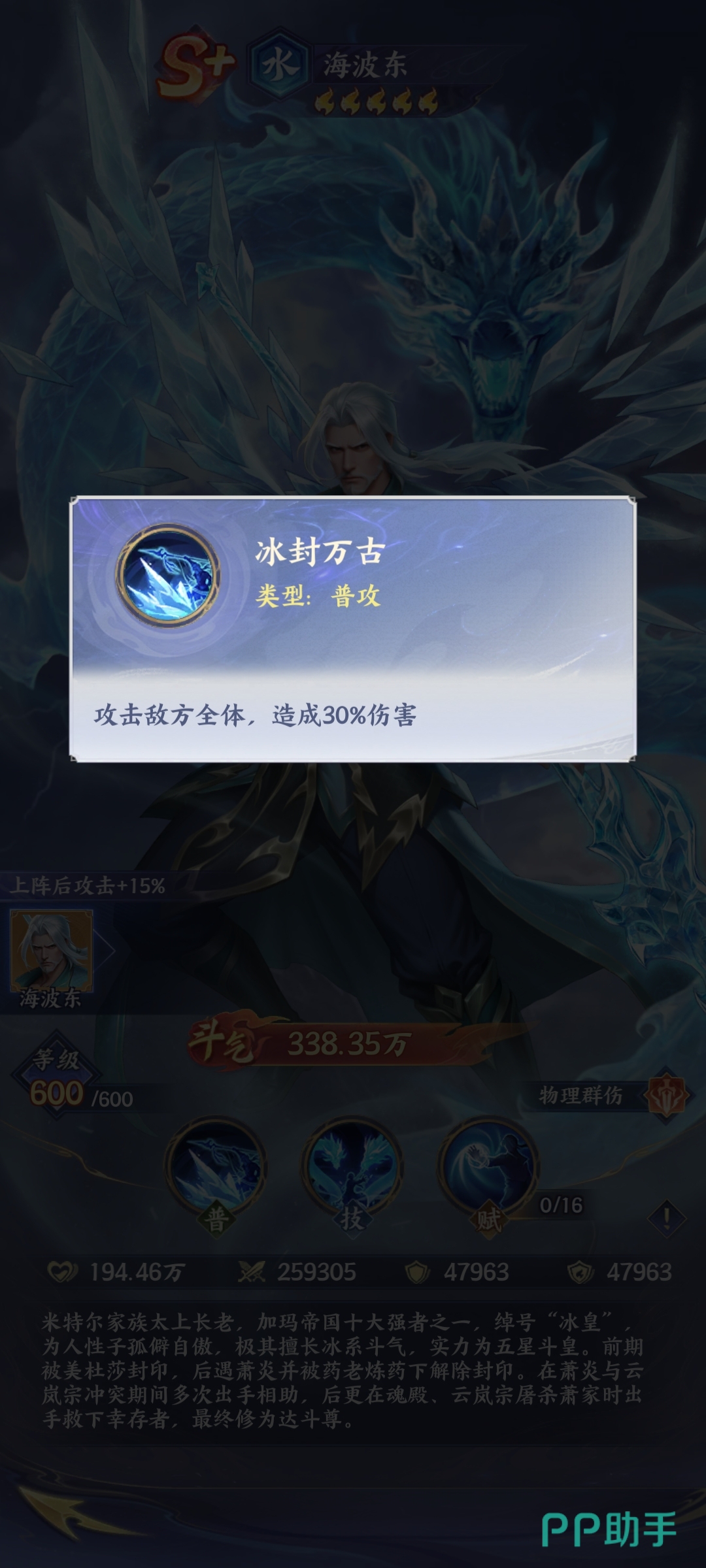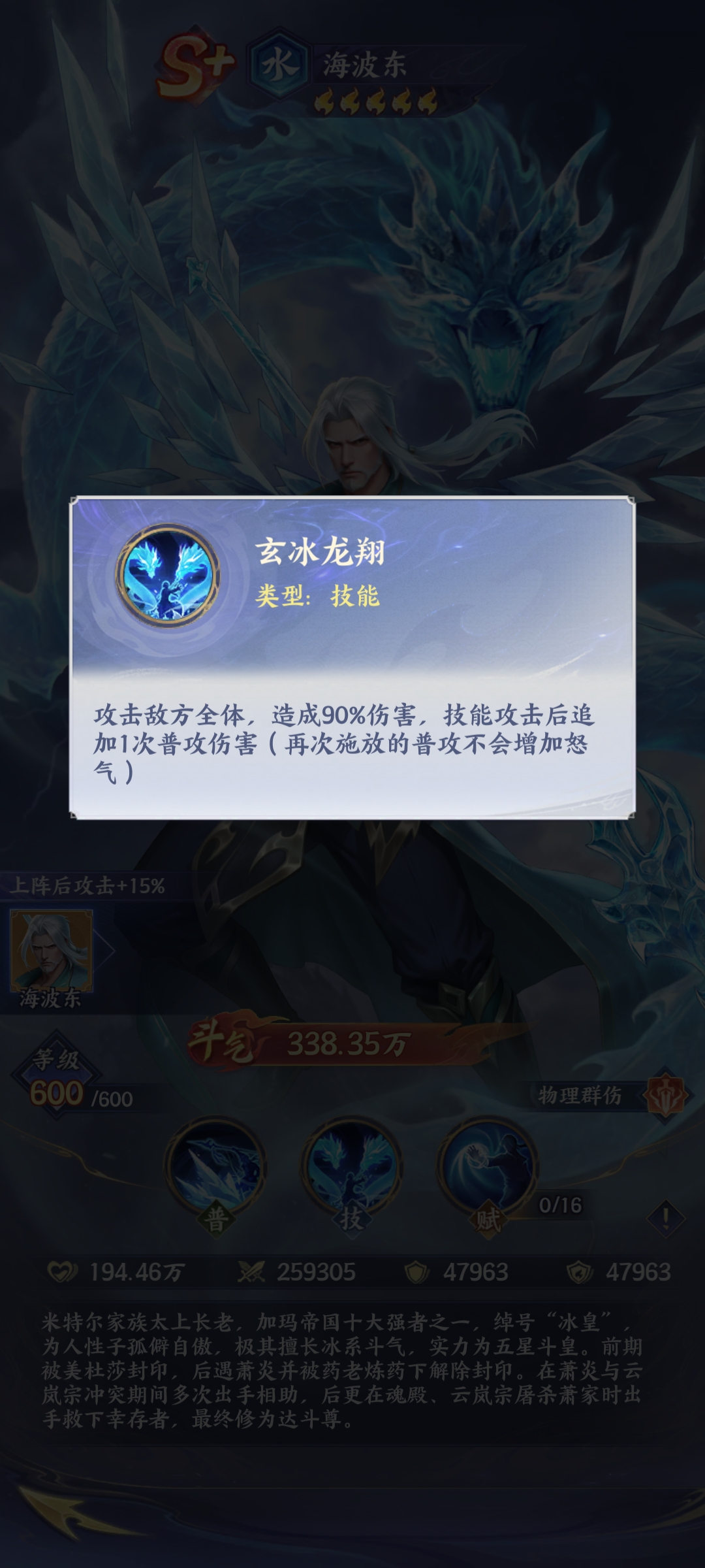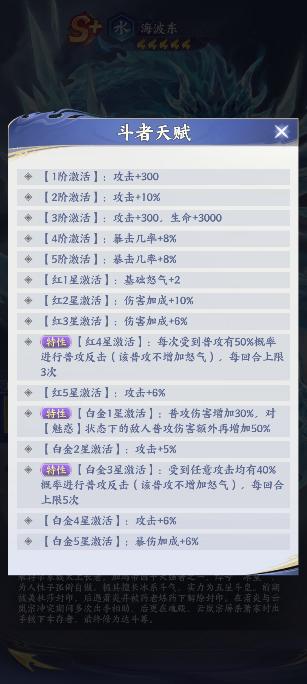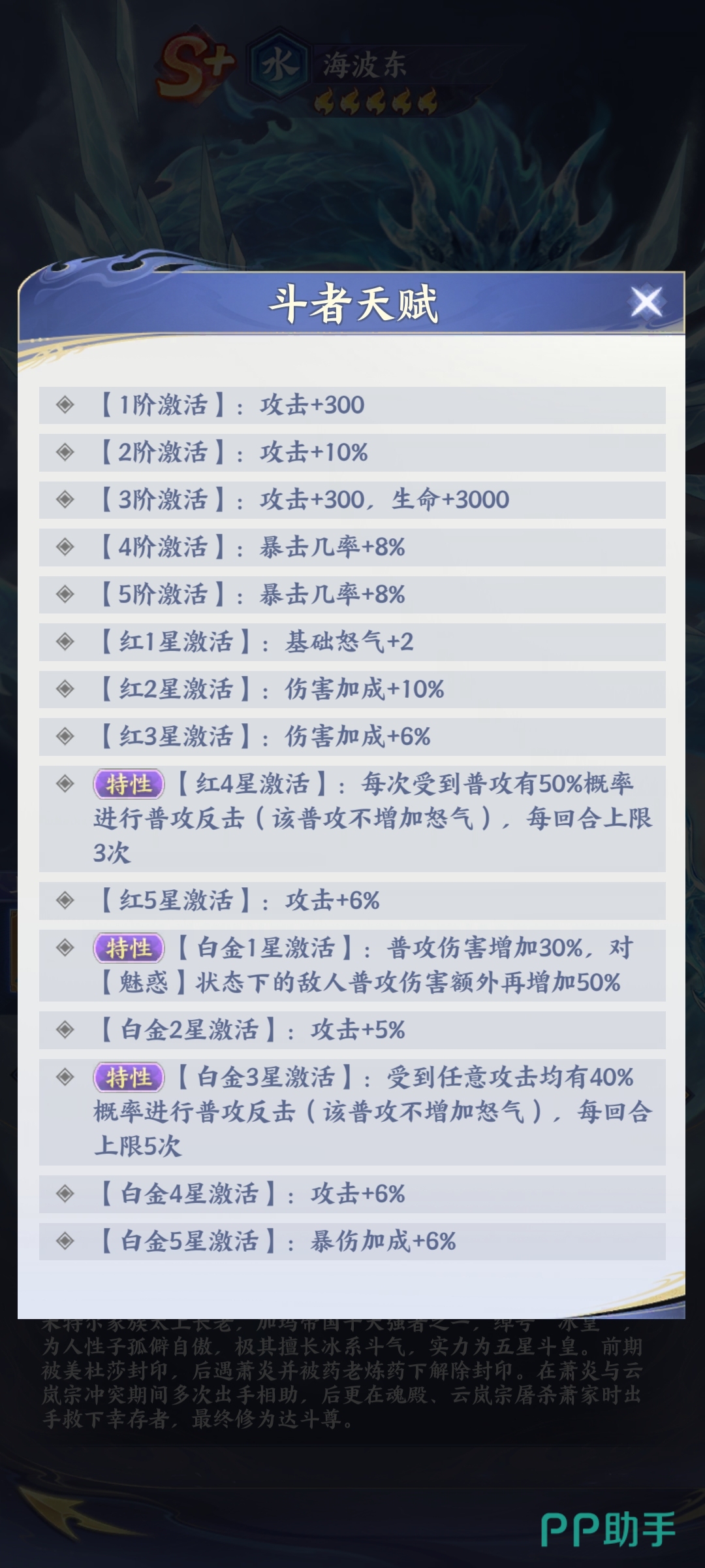 从基础战斗表现来看,海波东属于S+级水系物理纯伤斗者,定位为稳定型群体输出角色。其普攻技能“冰封万骨”虽为初始技能,但具备全体目标打击能力,伤害虽非爆发式,却拥有极高的命中率与频率稳定性,可在多段连击中持续施加伤害压力,有效压制敌方前排生存节奏。