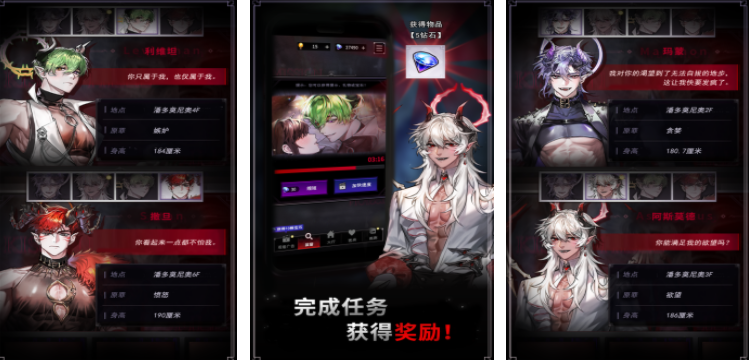 地狱之吻是一个别具一格的互动剧情手游,游戏里玩家将会结识地狱里面的恶魔,这些恶魔都有双重身份,在和这些恶魔相处的过程中,玩家发现每一个恶魔对自己都有感情,玩家需要在他们之间抉择,选择自己喜欢的恶魔进行互动,在这个过程中将会用爱情去感化他们,暗黑的地狱风格,加上恶魔的设定,可以让玩家的恋爱冒险变得更加独特。