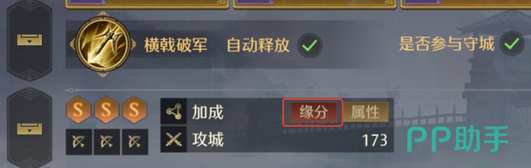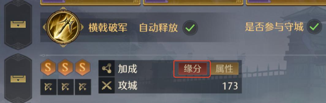除阵营类缘分外,游戏还设定了兵种协同机制:当队伍中三名武将的弓兵、骑兵或步兵资质同为S级时,可额外激活“三S兵种共鸣”,提供专属属性增幅。该效果与缘分系统并行不悖,在编队界面底部加成栏中统一呈现,右侧配有专属缘分标识便于识别。