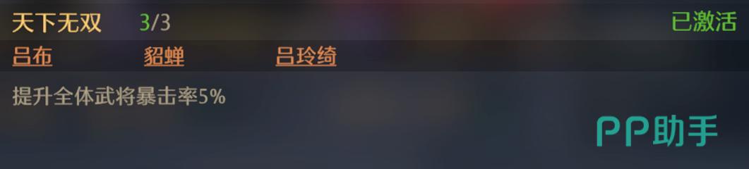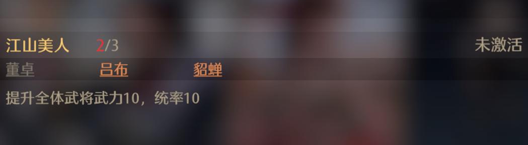 典型缘分案例包括:“天下无双”需吕布、貂蝉、吕玲绮三人同队,激活后全体暴击率提升5%;“江山美人”则要求吕布、貂蝉、董卓同时在列,提供全体武力+10、统率+10的基础属性加成。任一成员缺失均无法触发对应效果,系统亦不会进行降级兼容。