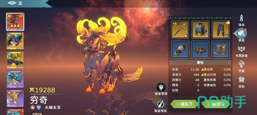 接下来谈谈小龙们的装备体系,在小龙的升级界面中,有六个格子会以红框标示,它们便是装备栏,每只龙都拥有六个装备部位,分别是武器、头盔、护腿、胸甲、圣物和专武,其中前四种装备按照品质高低依次分为普通、罕见、稀有、神话、传说、史诗六个等级,圣物则需从神秘的时空幻境中探险获取,而专武则在小龙进化到9星后自动解锁,但需注意并非每条龙都有幸拥有专武,为了方便玩家操作游戏设置了一键穿戴功能。