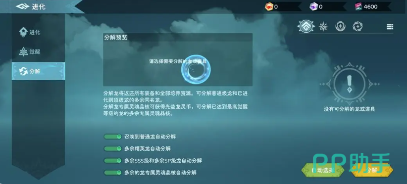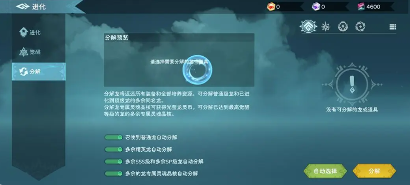 重生的这个功能有着特定的触发条件,当玩家拥有两个及以上精英级一星的龙时,便可以选择回退其中品质相对较低的那一条龙,回退操作完成后,系统将全额返还该龙的本体以及所有在养成过程中所消耗的材料,需要注意的是只有初始品质为精英级的龙才具备回退资格,此外游戏还配备了完善的分解系统,为玩家提供了多样化的选择,召唤到普通龙时可自动进行分解,多余的精英龙也能够自动分解,对于多余的SSS级和SP级龙同样支持自动分解,多余的龙专属龙魂晶核亦可自动分解。