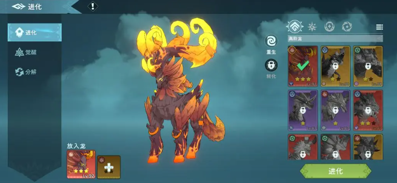 游戏中每条小龙都有着无限的潜能上限,一旦其当前能力触及这一上限,就必须借助进化之力突破提升品质,才开启后续的升级,具体操作而言便是让小龙吃狗粮,在低星阶段,用于喂养的狗粮必须是与要升级的龙同体的个体,而当小龙达到高星级别后,则可以使用同属性同星级的任意狗粮来进行喂养,在进化界面中,有两个醒目的小圆圈,其中一个标注着重生功能。