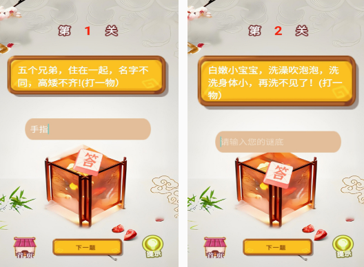 相对于涵盖一种题目类型的猜谜手游,这款涉及的领域特别多,题目也很丰富,能让玩家在玩的时候,享受趣味答题游戏所带来的快乐,也能展现出自己在猜灯谜,或者是各种题目这方面所具备的实力。对于孩子来说,也能在游戏中利用闯关的方式了解古今灯谜。无论是需要在谜题中打各种物品,都需要将谜底输入正确以后,才能进入下一题。
