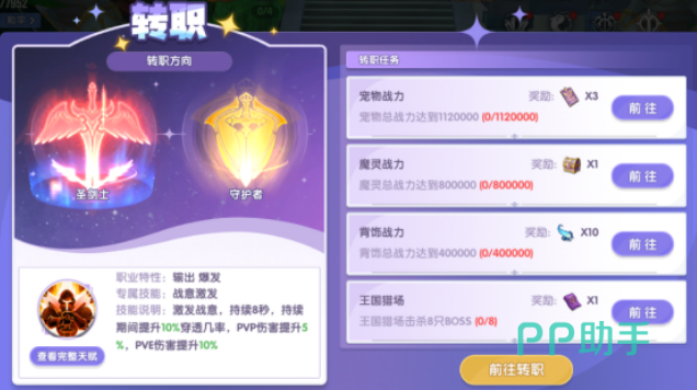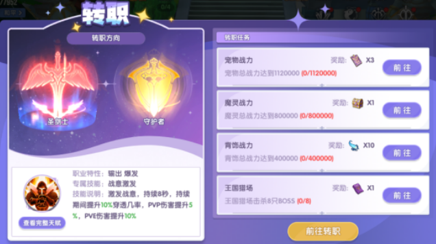 当等级、技能点及任务进度全部达标后,系统将在任务日志中自动激活“战士转职”主线任务链,并提供清晰指引。玩家可依提示依次完成NPC对话、副本攻坚等环节,最终抵达转职圣地。在此场景中,系统将开放双向选择界面,玩家可根据自身操作习惯、队伍配置需求或当前主流PVE/PVP环境,自主决定进阶方向——圣剑士或守护者,无绑定限制,不可逆操作前支持充分预览。