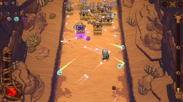 角色系统提供多维成长路径:每位英雄拥有独立技能树、属性倾向与被动专精,玩家可根据关卡特性灵活切换阵容。单人模式作为核心体验形式,强调角色协同策略与操作精度——武器发射的弹珠具备物理反弹机制,击中场景障碍物后回弹,再次触发发射将叠加动能,显著提升输出强度。当两种不同类型的弹珠均升至指定等级后,即可投入合成系统,生成具备复合属性的新弹珠,伤害类型、范围、附加状态等维度全面升级。