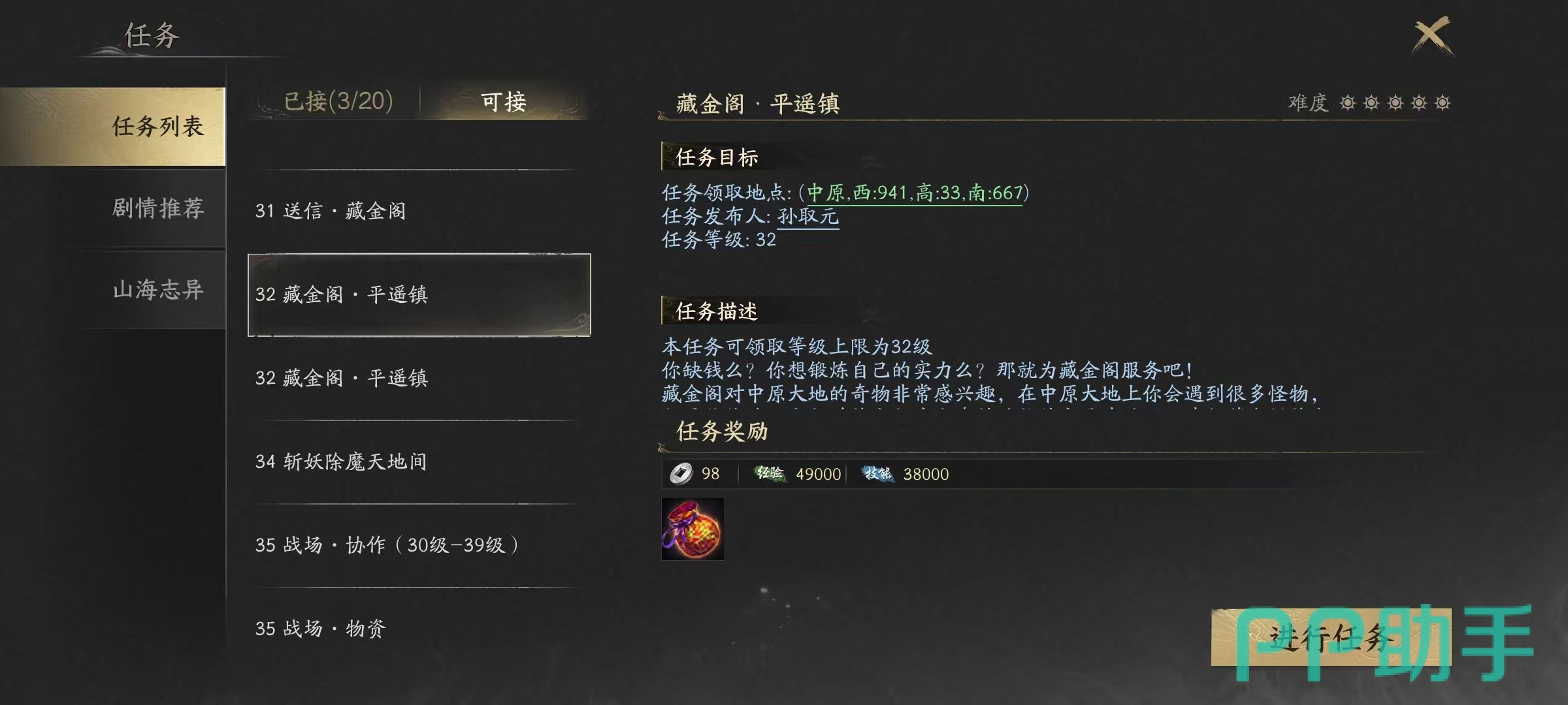 【藏金阁任务】角色等级高于30级即可直接接取,共设多个区域分支,每个区域对应不同等级段怪物。玩家需按任务指引前往指定地图击杀目标,成功后可获得奇石、玄铁、大量经验及技能点,并同步提升天宝声望。每类子任务每周限完成两次,建议优先选择与自身战力匹配的区域以提升成功率。