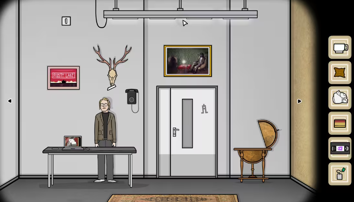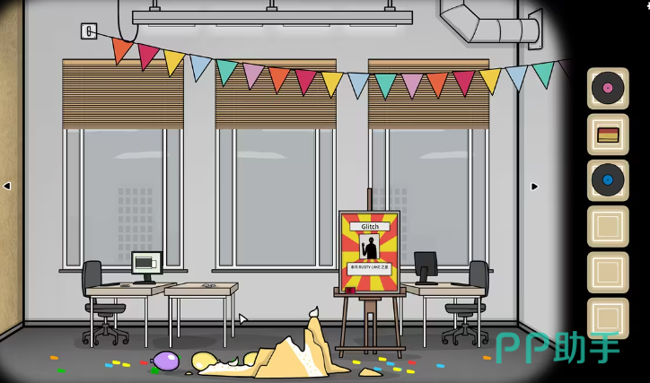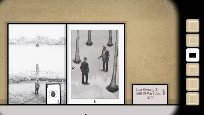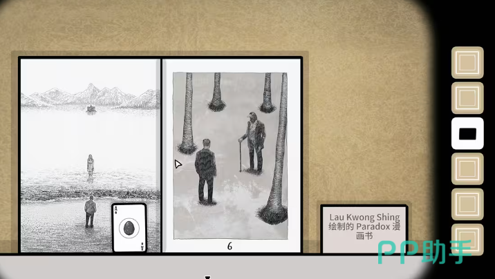 黑桃a这张卡牌也是隐藏的比较隐蔽的,许多玩家都找不到。那么其实只需要把左边的柜子放大,可以看到,在第3个格子中有一幅漫画,黑桃a的位置就在这幅漫画的右下角,点击即可收集成功。接下来点击这个柜子的下方向,右拖动即可把柜子的门给打开,并得到卡牌梅花Q。杯子上放着一盆绿植,玩家们多次点击这盆绿植就可以看到一张黑桃q掉在了地上,此时玩家们再去地上捡起来就可以。