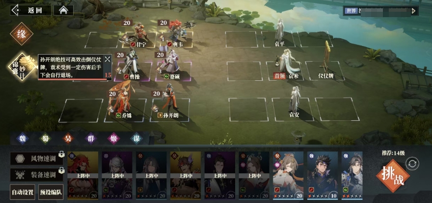 在战斗中前排的甲兵会在一定情况下直接撤退,这就为玩家创造了集中火力攻击袁术的机会,只要能够成功打掉仪仗牌,就可以迅速将战斗重心转移到袁术身上,在攻击仪仗牌时,要注意孙开朗的绝技消耗20点战意,因此位于他前面的队友在释放技能时要避免将战意耗尽,以确保孙开朗能够顺利释放出关键技能。