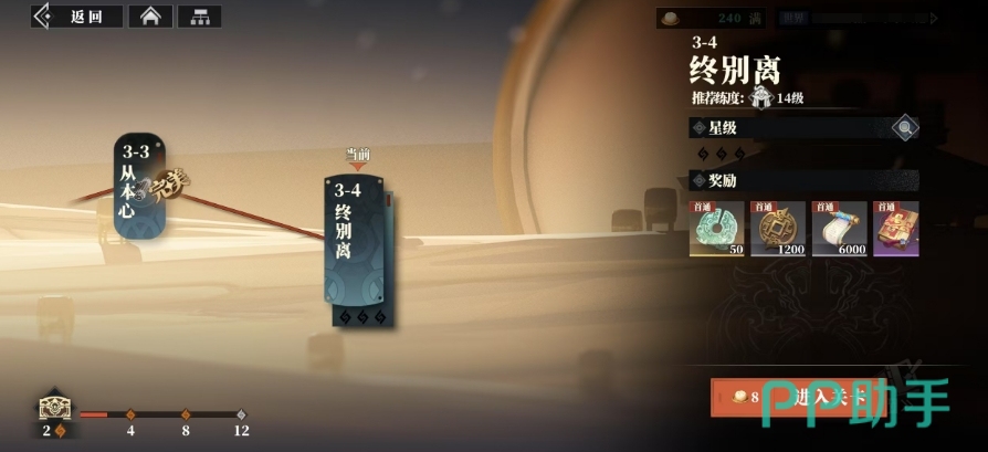 3-4关终别离中,玩家要与袁术进行切磋,并且需要在5回合内取胜,同时己方被击退的人数不能超过1人,只有满足这些条件才能获得3星过关评价,如果玩家采用常规的战斗思路或者直接开启自动战斗模式,很可能会在战斗中遭遇敌人数量不断增加的情况,这是因为没有合理的战术规划,随着战斗回合数的增加,敌人会越来越多,最终导致玩家无法成功过关或者需要花费许多回合才能艰难过关。