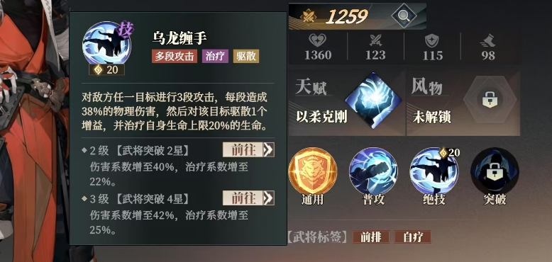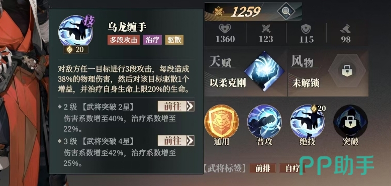 此时孙开朗就成为了关键人物,孙开朗的必杀技乌龙缠手具有多重效果,该技能可以对单个目标进行3段攻击,每段能造成4096点物理伤害,这对于仪仗牌来说是克制的,而且每段攻击还能驱散目标身上的1个增益效果,并治疗自身生命上限2296的生命值。这意味着在攻击仪仗牌后,孙开朗仍能保持一定的生存能力,不会因为输出而轻易牺牲。