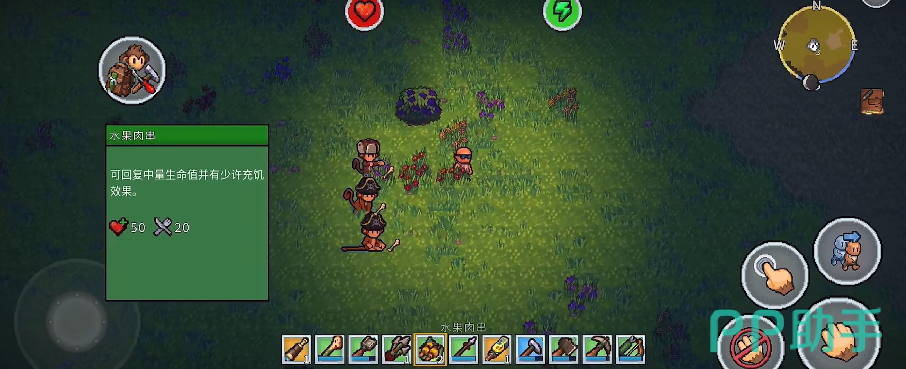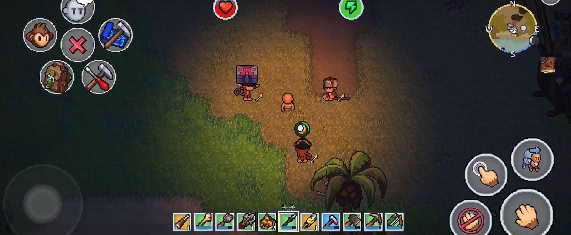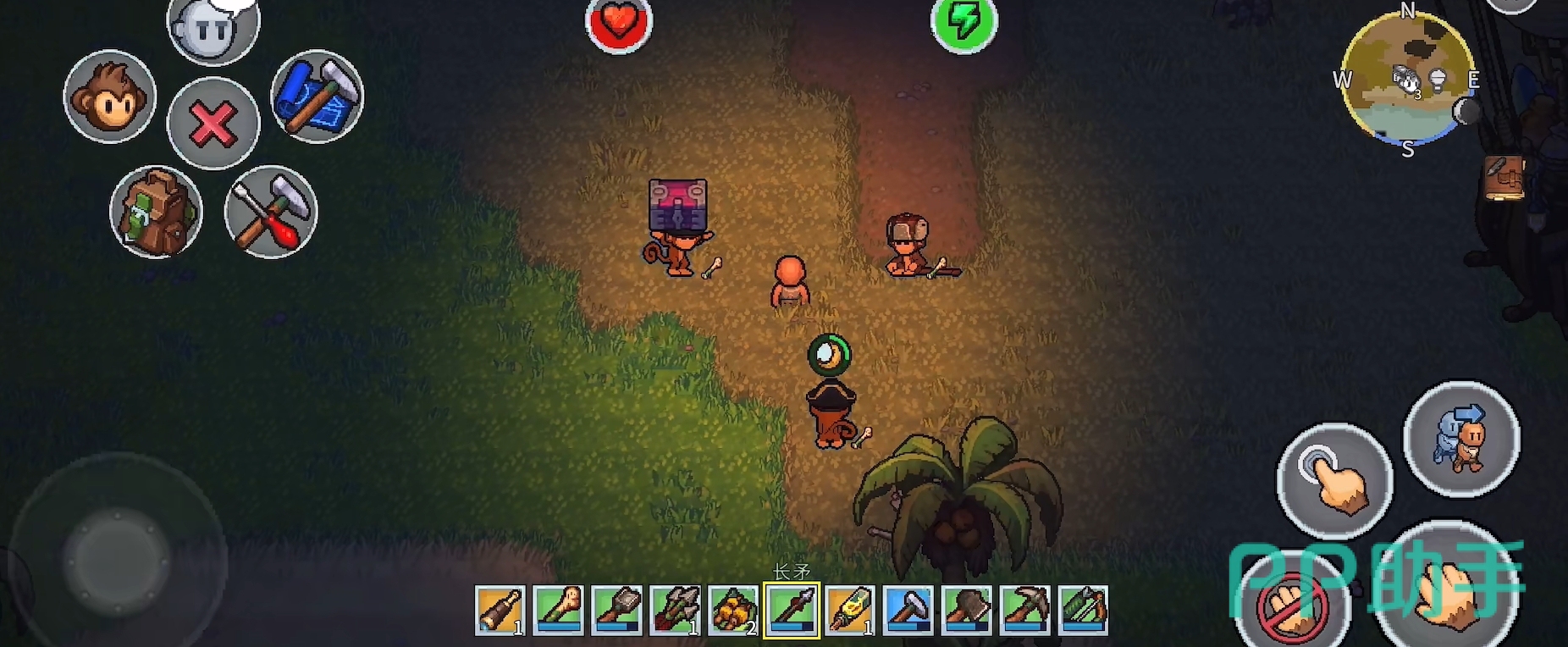 生存挑战并非仅限于资源管理。夜幕降临后,岛屿生态发生显著变化,敌对生物频繁出没,威胁玩家安全。此时需依靠自制武器与防具提升战力,同时合理规划照明与防御工事。值得关注的是,游戏中引入了独特的“灵猴协作”机制:解救被困于笼中的野生猴子后,它们将主动追随玩家,并智能复现玩家动作——例如同步挥斧伐木、挖掘泥土;遇敌时自动发起攻击。玩家还可为其打造专属装备,强化其耐久与伤害,使其成长为可靠战斗伙伴与高效劳力助手。