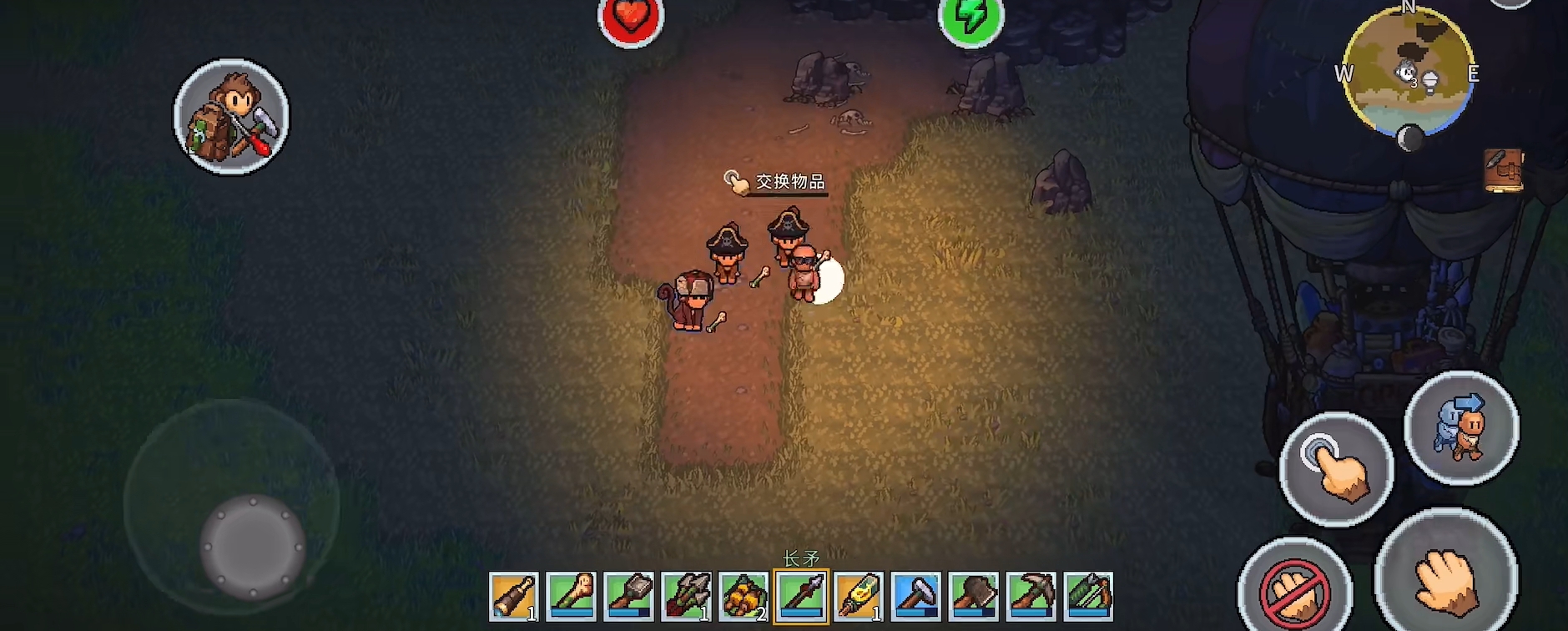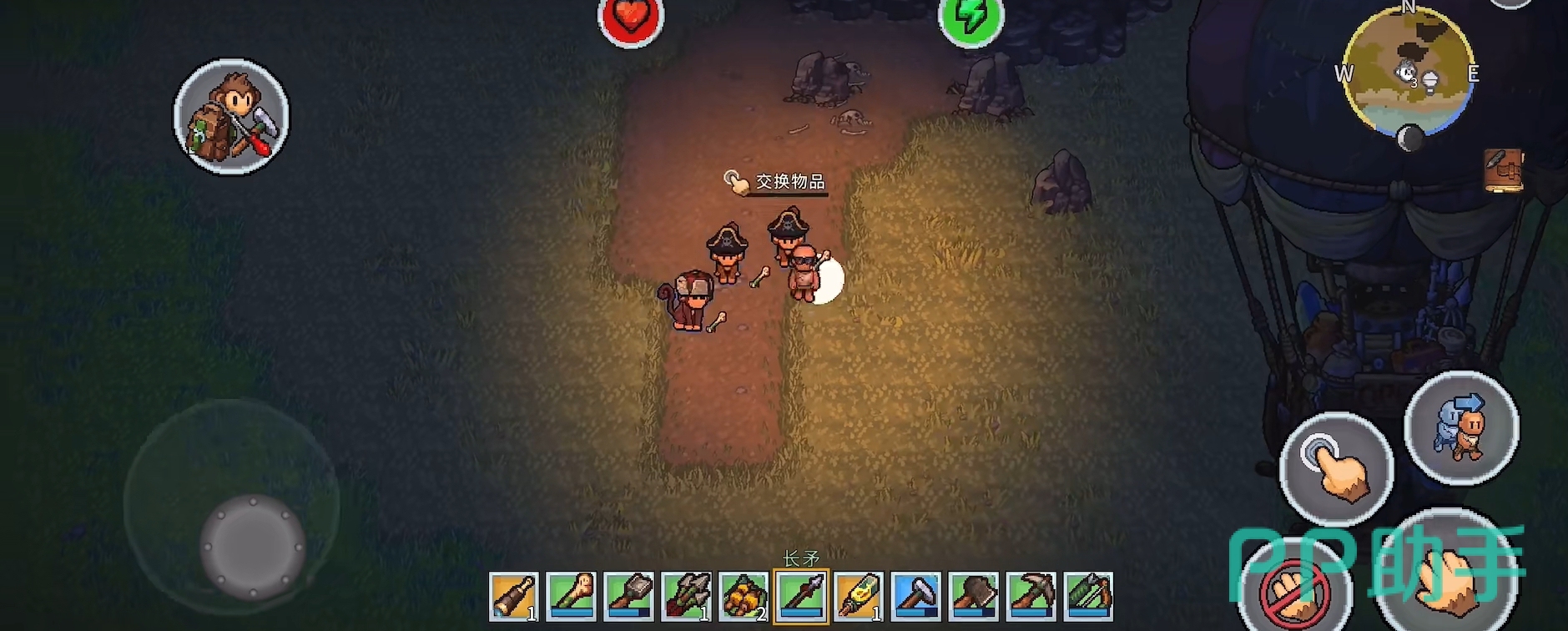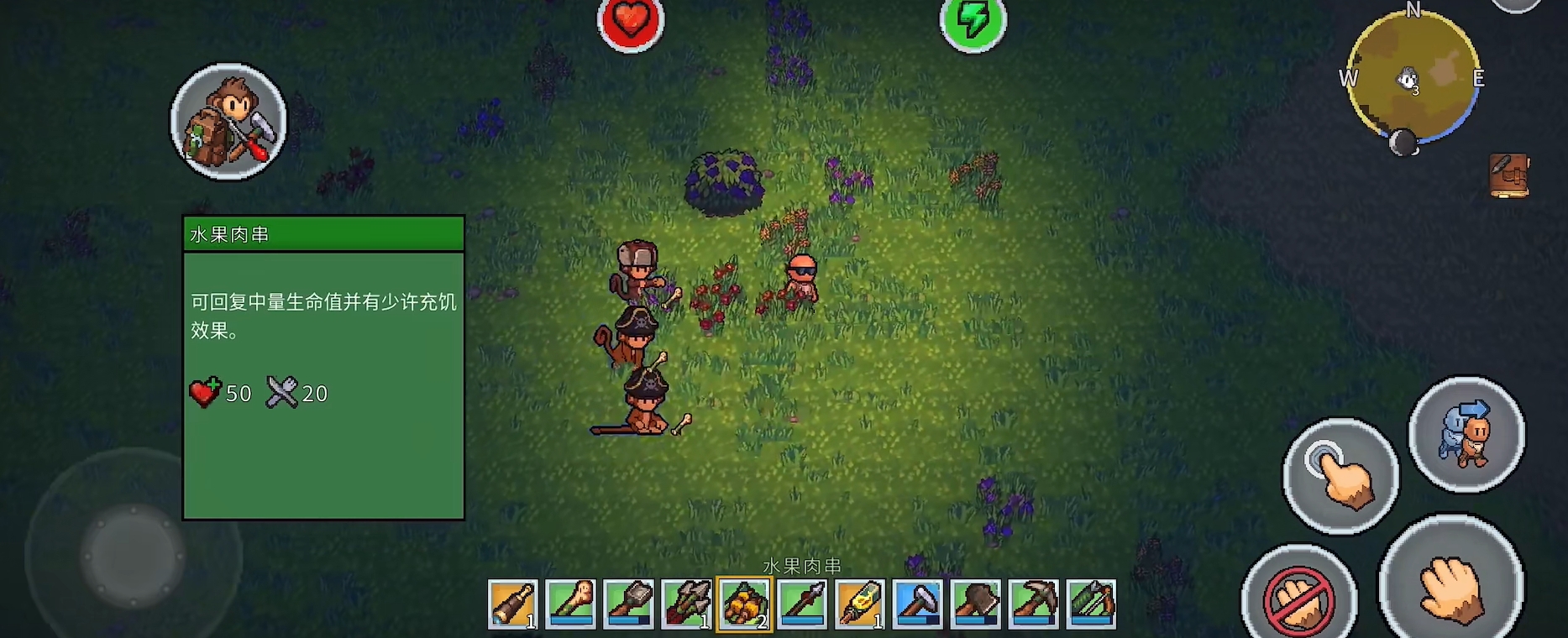 生存挑战并非仅限于资源管理。夜幕降临后,岛屿生态发生显著变化,敌对生物频繁出没,威胁玩家安全。此时需依靠自制武器与防具提升战力,同时合理规划照明与防御工事。值得关注的是,游戏中引入了独特的“灵猴协作”机制:解救被困于笼中的野生猴子后,它们将主动追随玩家,并智能复现玩家动作——例如同步挥斧伐木、挖掘泥土;遇敌时自动发起攻击。玩家还可为其打造专属装备,强化其耐久与伤害,使其成长为可靠战斗伙伴与高效劳力助手。