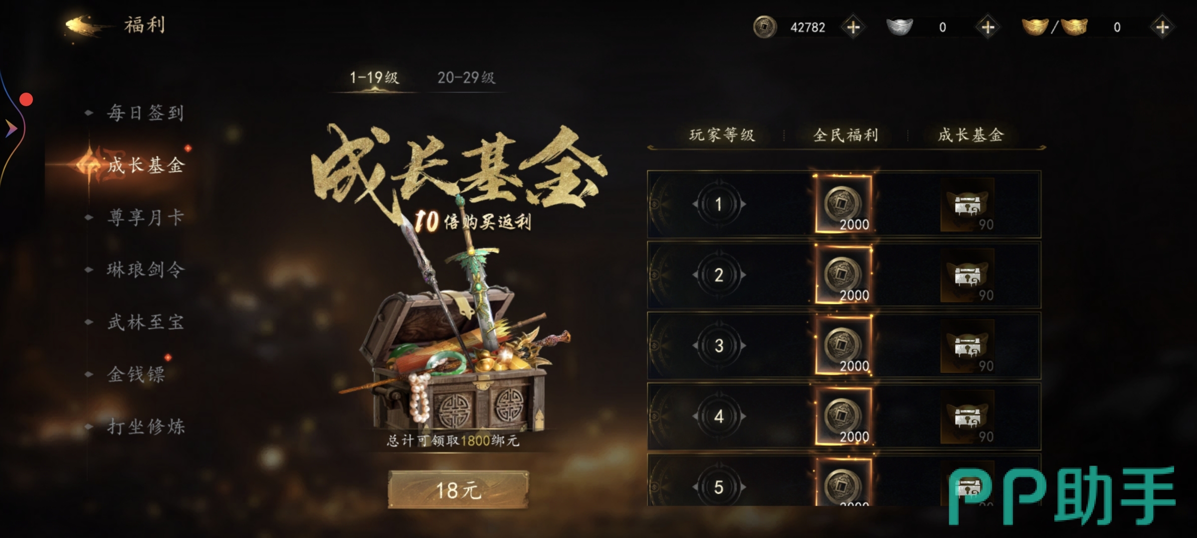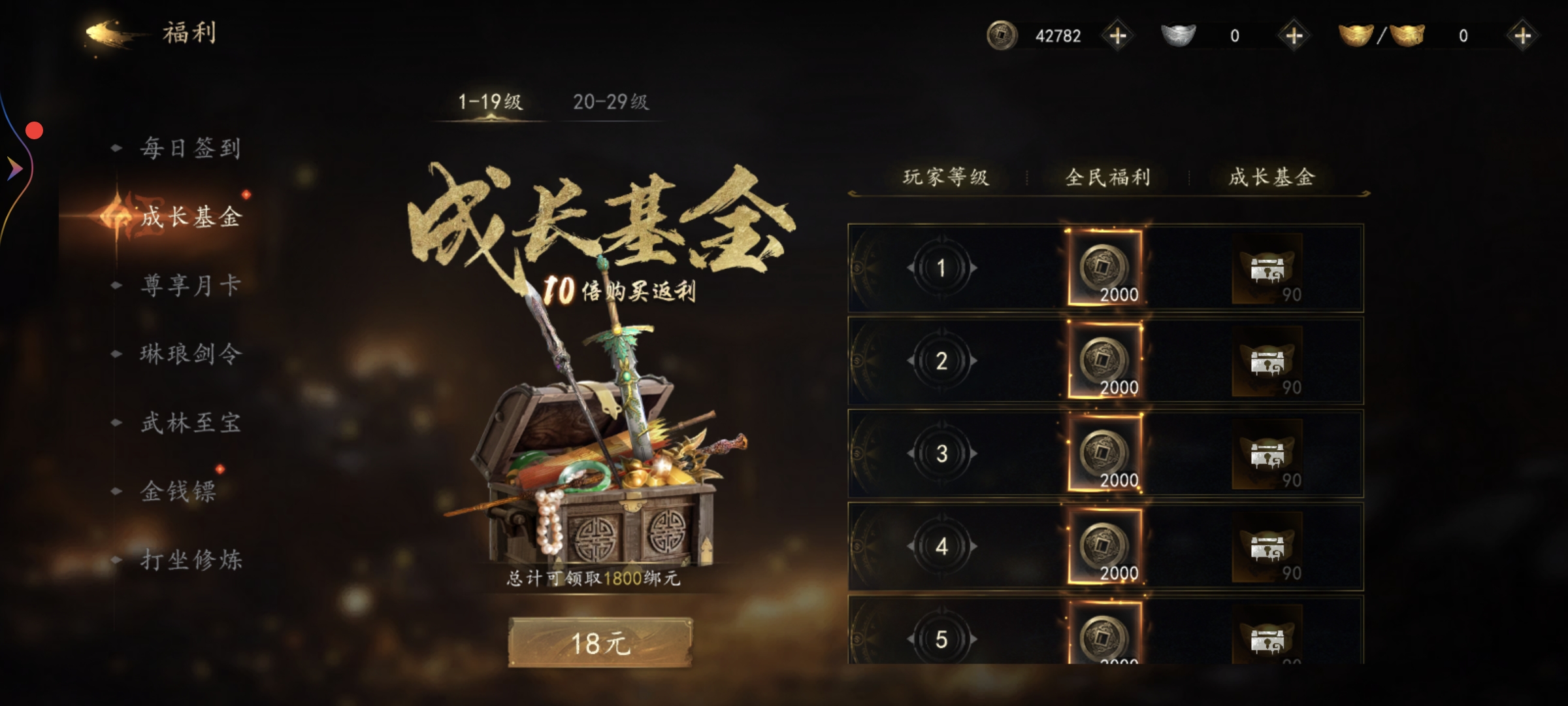 成长基金是一个也可以的持续不间断领资源的地方,只要充值18元就能的得到1800的绑定元宝,还有不间断的资源。
