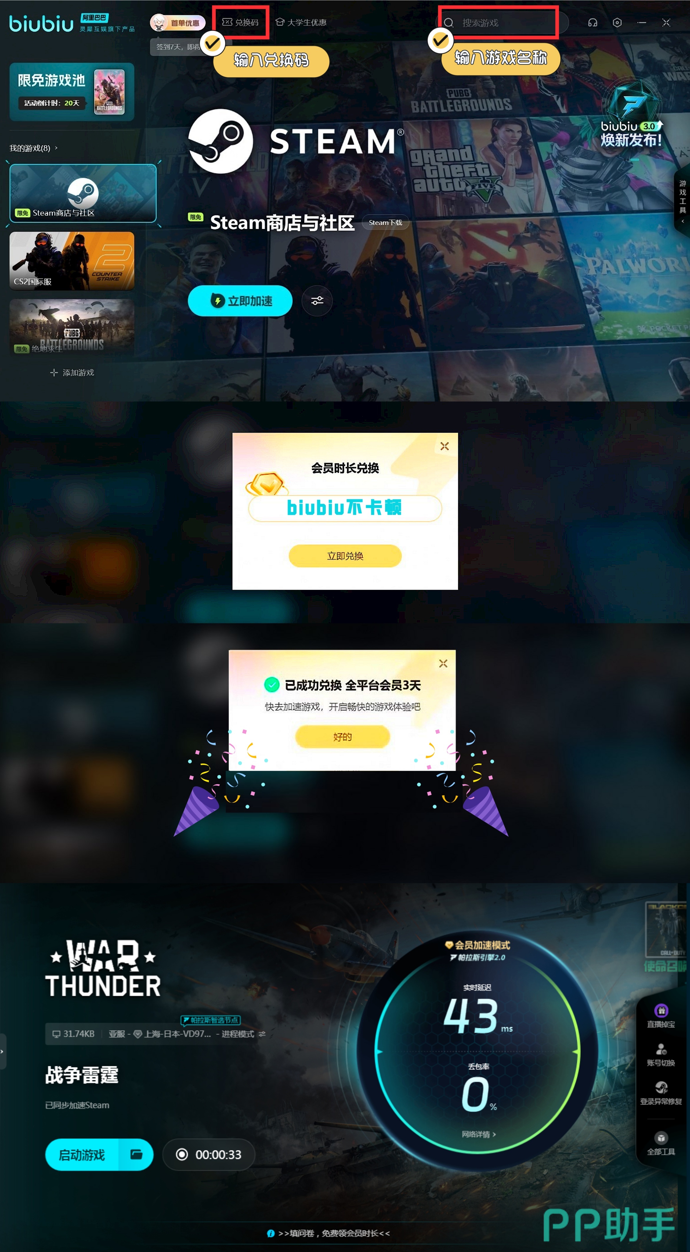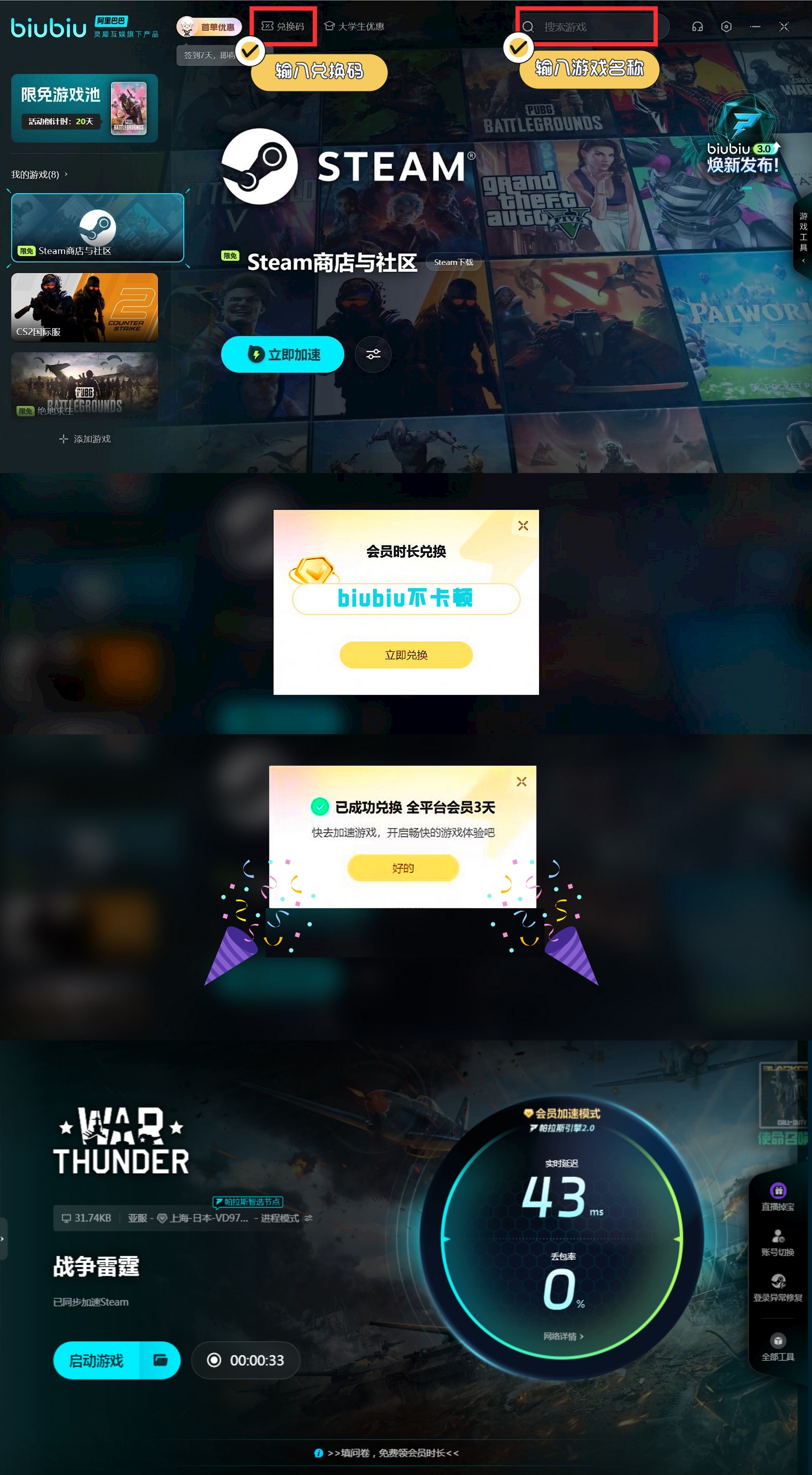 若是各位到时希望能解锁更多加速时长,那么可主动来点击界面中兑换按钮,然后利用【biubiu不卡顿】,这样所有平台用户均可顺利解锁72h的加速机会哦。