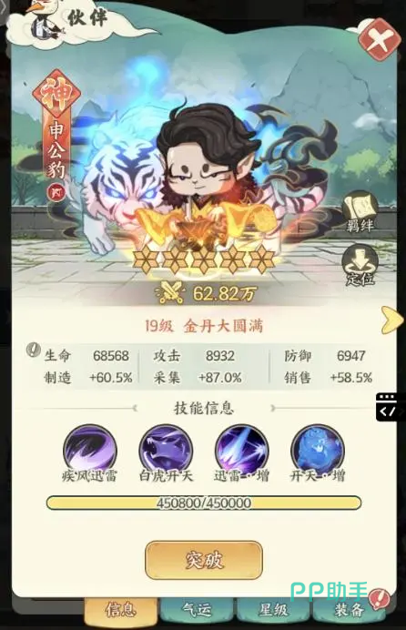 定位:团队增益+范围聚怪+防御压制型全能辅助。技能“疾风迅雷”对单体造成100%攻击力伤害;大招“白虎开天”撕裂空间形成引力漩涡,将大范围敌人拖拽至中心并造成900%攻击力伤害,同时施加防御降低5%效果,最多叠加3层,持续3秒;被动“迅雷之势”使每次释放“疾风迅雷”后提升自身攻速,最多叠加5层;被动“梵天神体”使全体队友共享施法者15%基础防御力。