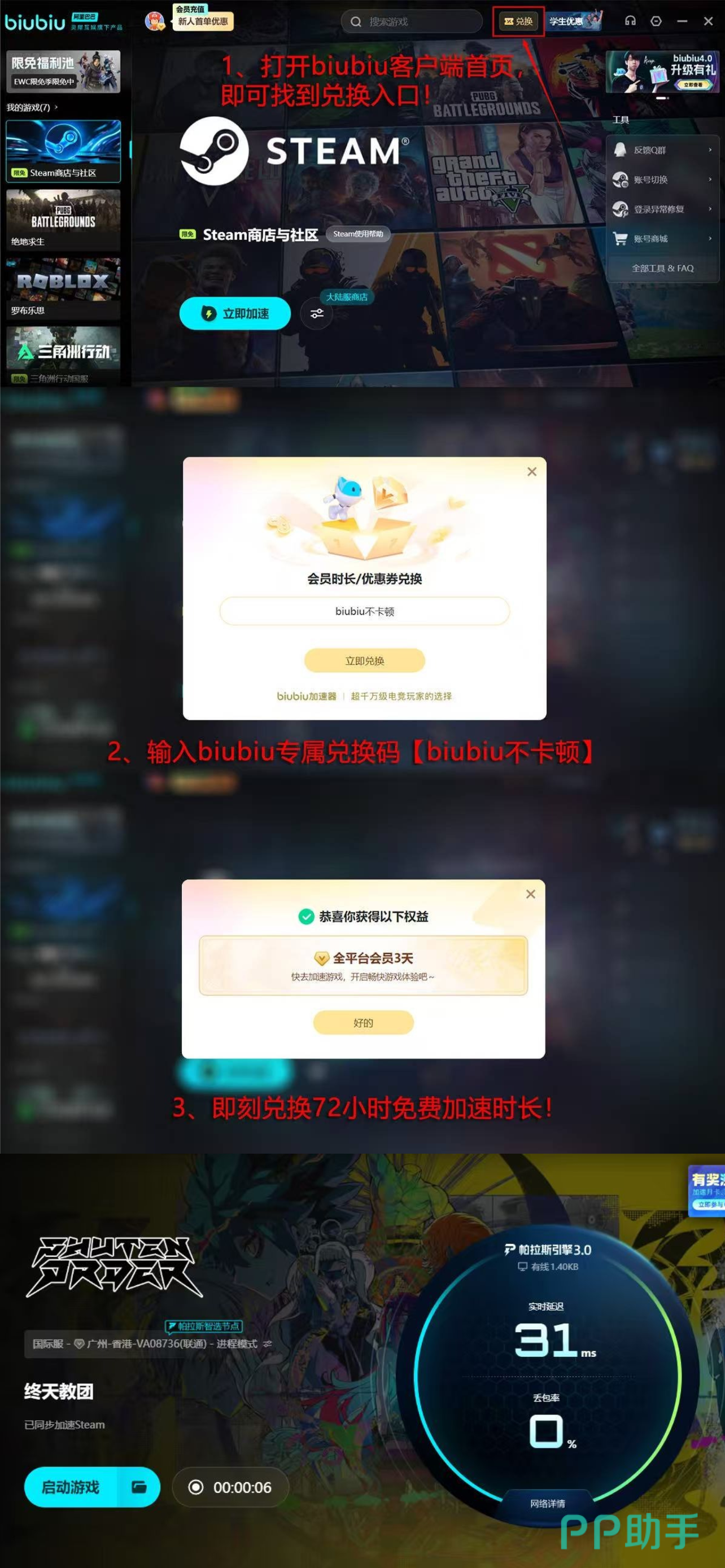 若在下载或运行过程中遇到网络延迟问题,建议提前配置合适的网络优化工具。该工具支持对Steam平台进行连接优化,有效提升下载速度与游戏稳定性。新注册用户登录后即可免费享受24小时高速服务,同时平台还为其他用户提供额外三天的试用时长,只需在指定区域输入【biubiu不卡顿】即可领取。