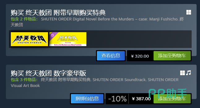 目前在Steam平台上,终天教团提供了两个主要购买选项:标准版定价为320元,数字豪华版则为387元。标准版包含游戏本体以及早期购入奖励内容;而数字豪华版在涵盖标准版所有内容的基础上,额外追加了官方原声音乐集,适合希望收藏完整内容的玩家选择。