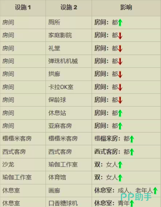 目前先从房间的整体状态来看,如果在房间当中增加厕所设施和亚麻客房设施以及休息站都会提升全员的好感度,从而吸引到更多的顾客。而增加家庭影院、礼堂和卡拉ok室等一些基础性设施会使得全员的好感度都有所下降(猜测因为太吵影响休息),所以这一点还是要注意一下的。除此之外,也有一些特殊设施会使特定人群的好感度提升,在沙龙房当中增加瑜伽工作室会使女性群体的好感度大大上升,从而吸引更多的女性顾客。