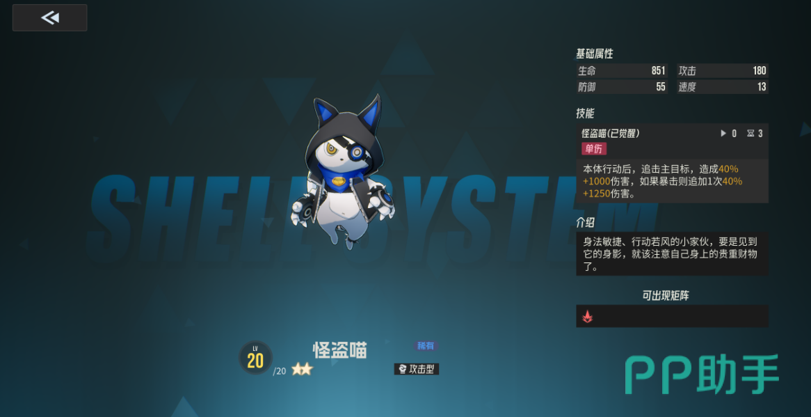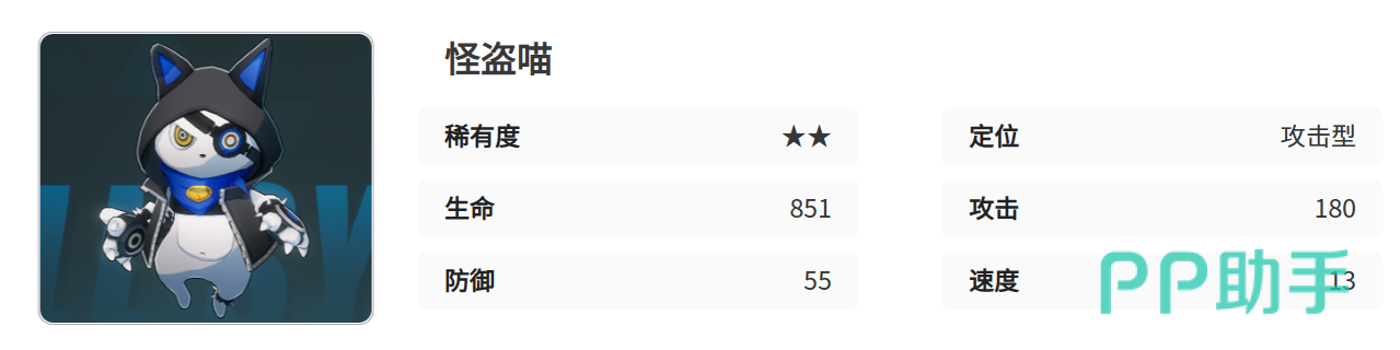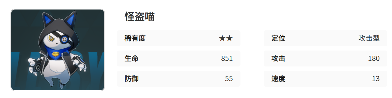 作为功能性辅助,怪盗喵的核心优势不在于直接输出,而在于技能联动与节奏控制。其追击伤害机制可在本体行动后对主目标造成40%+1000点附加伤害,若触发暴击则可额外追加一次打击。因此,在队伍配置时推荐搭配具备高暴击率的角色,以提升追击触发频率,从而增强整体输出效率。