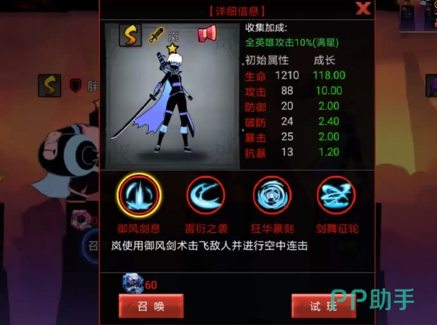 岚:它是用剑的一个英雄,其控制能力和连招手感都非常不错,一技能不仅能击飞对手而且能于空中进行多段连击,另外二技能的突袭和三技能的群体伤害也都有着非常强悍的清怪能力,大招的话则能在攻击敌人多次的同时给予自身无敌效果,整体来看的话是一个操作,机制与属性并存的全能英雄。