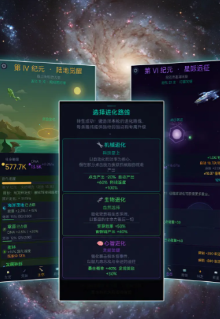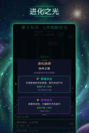 本作采用非线性演化树结构,玩家可在每个重大节点自由选择分支方向,例如向深海生态、陆地集群或生物智能等不同维度发展,无强制固定路线。同时内置「永恒轮回」机制:每次演化失败后,部分核心属性(如基础代谢率、遗传稳定性)将以永久形式保留,使后续尝试具备天然优势。该设定既降低挫败感,又保障长期成长反馈,契合碎片化时间下的休闲体验需求。游戏整体体量精简,无需持续在线,单次操作耗时短,且不设强制付费门槛。