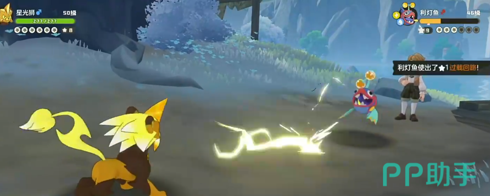 首场战斗中,基恩派出的第一只精灵是兼具电系与水系特性的利灯鱼。由于电系技能对自身属性存在抵抗效果,推荐使用星光狮出战,连续释放两次2星技“离子火花”即可完成压制。随后登场的是纯水系精灵蓝蝶鲨,电系对其具有明显克制优势,无需更换精灵,直接使用一次离子火花便可取胜。