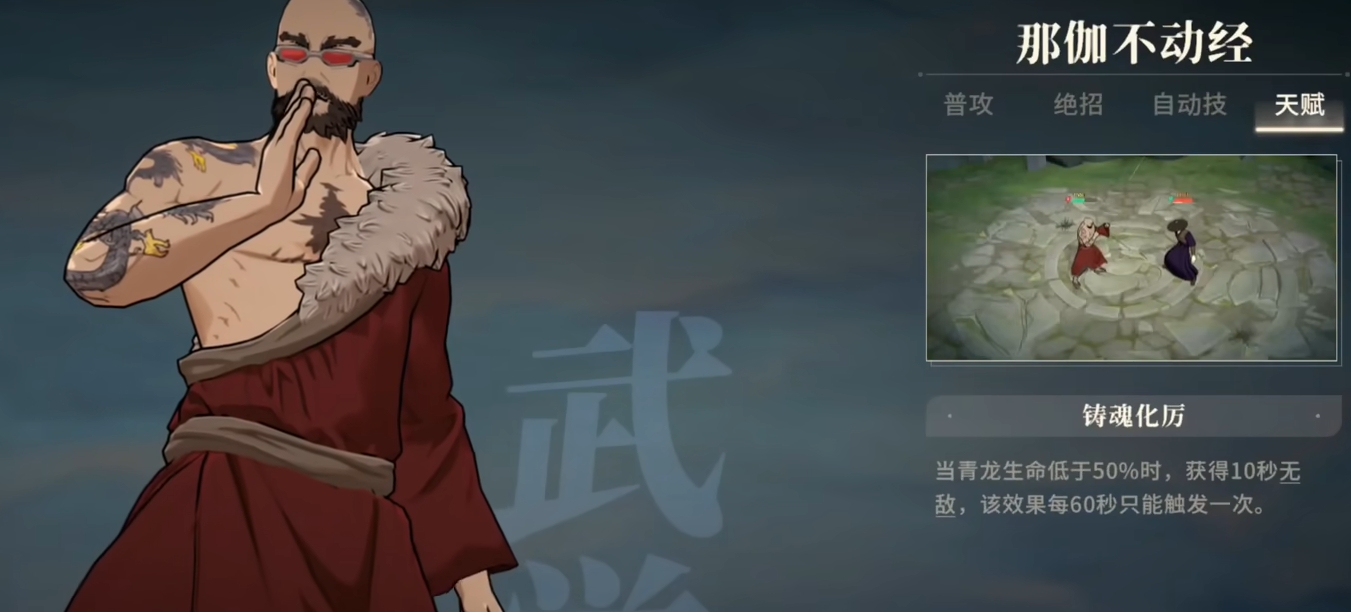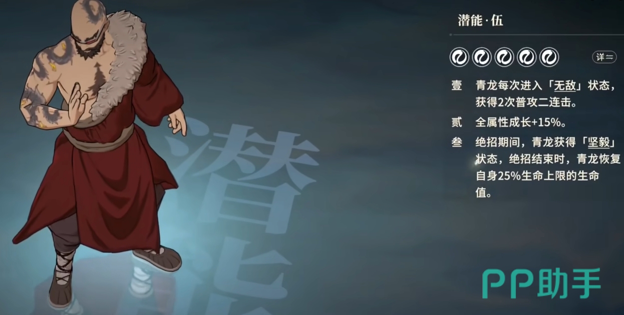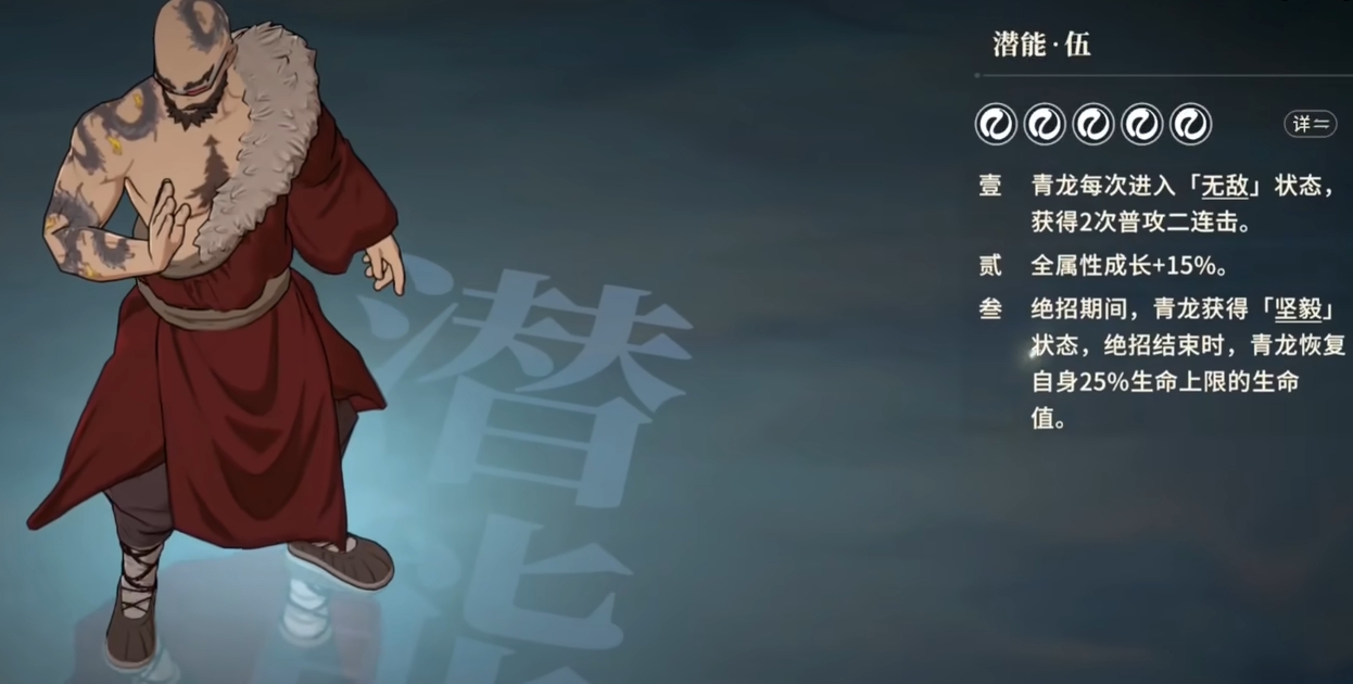 双层无敌机制不仅大幅提升了青龙的战场容错率,更为其绝招的稳定释放提供了保障。青龙在施放绝招时,将立即扣除自身20%的生命值,并进入“神通显现”状态。在此状态下,他的攻击力、暴击率与爆伤属性均获得显著提升,输出能力达到巅峰。需要注意的是,一旦青龙生命值低于5%或被击败,该状态便会立刻中断。然而,借助天赋与自动技提供的无敌效果,玩家完全可以规避这一风险,确保他在绝招期间不受干扰地倾泻火力。